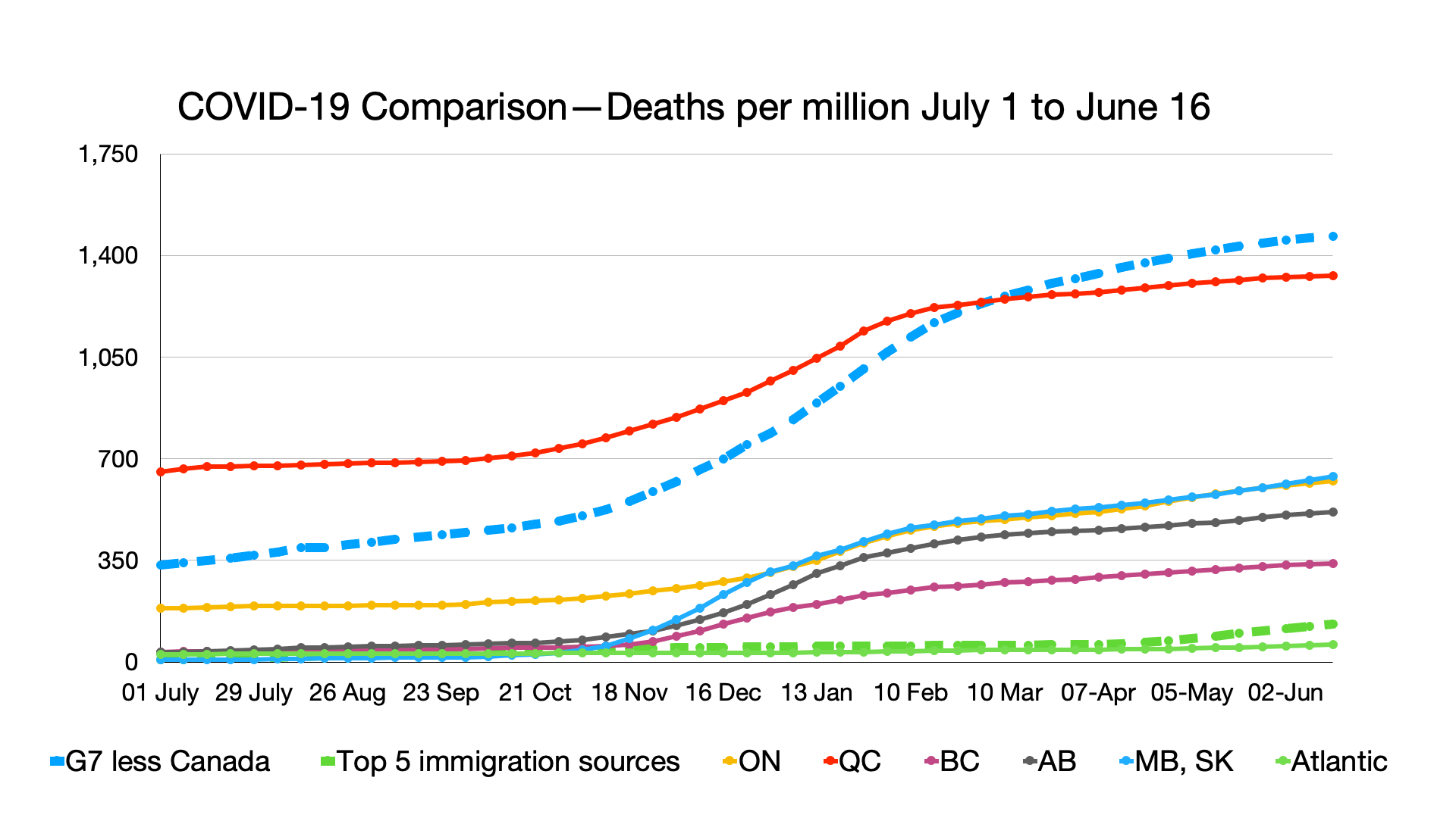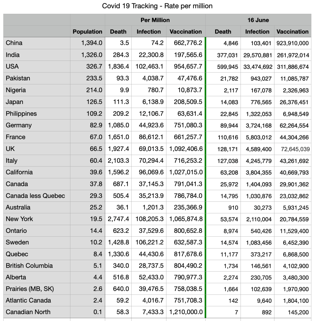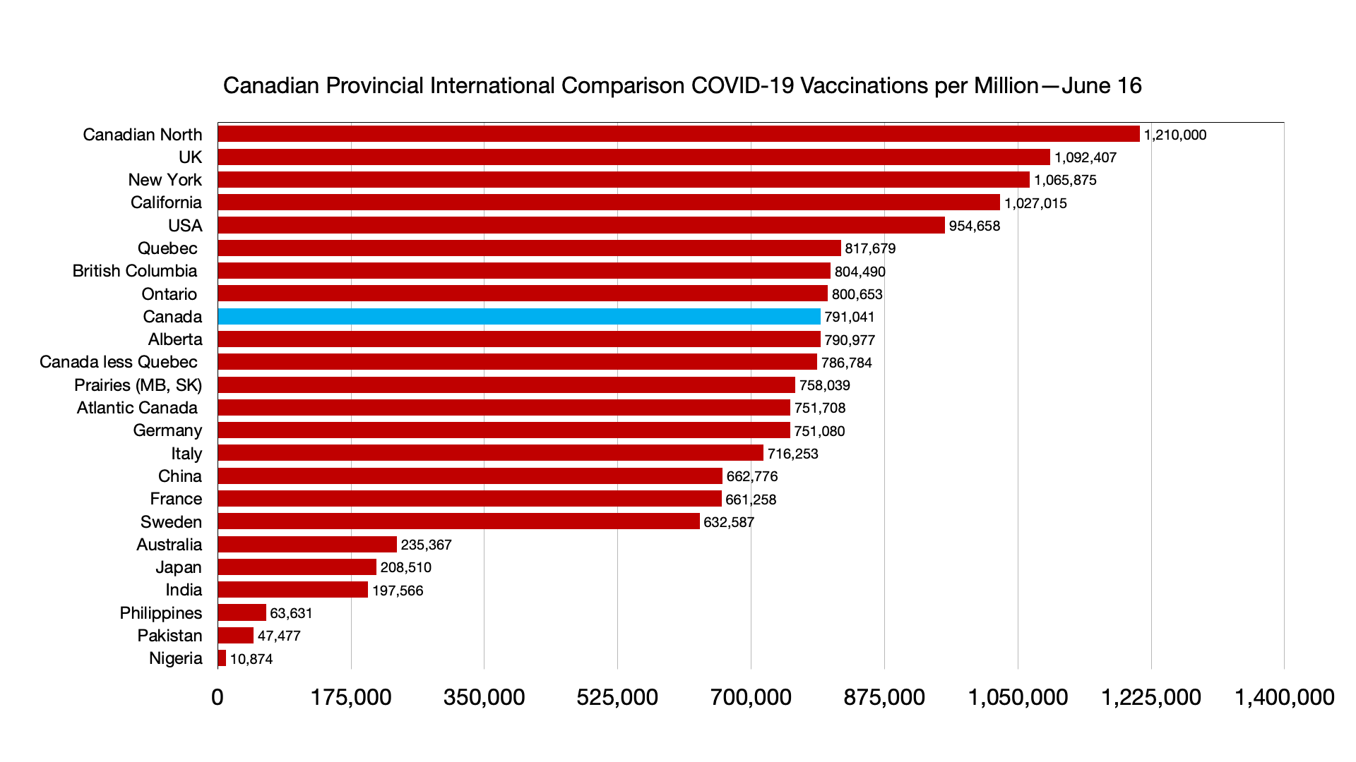 The latest charts, compiled 16 June as overall rates in Canada continue to decline along with increased vaccinations (still largely first dose, fully vaccinated just under 14 percent).