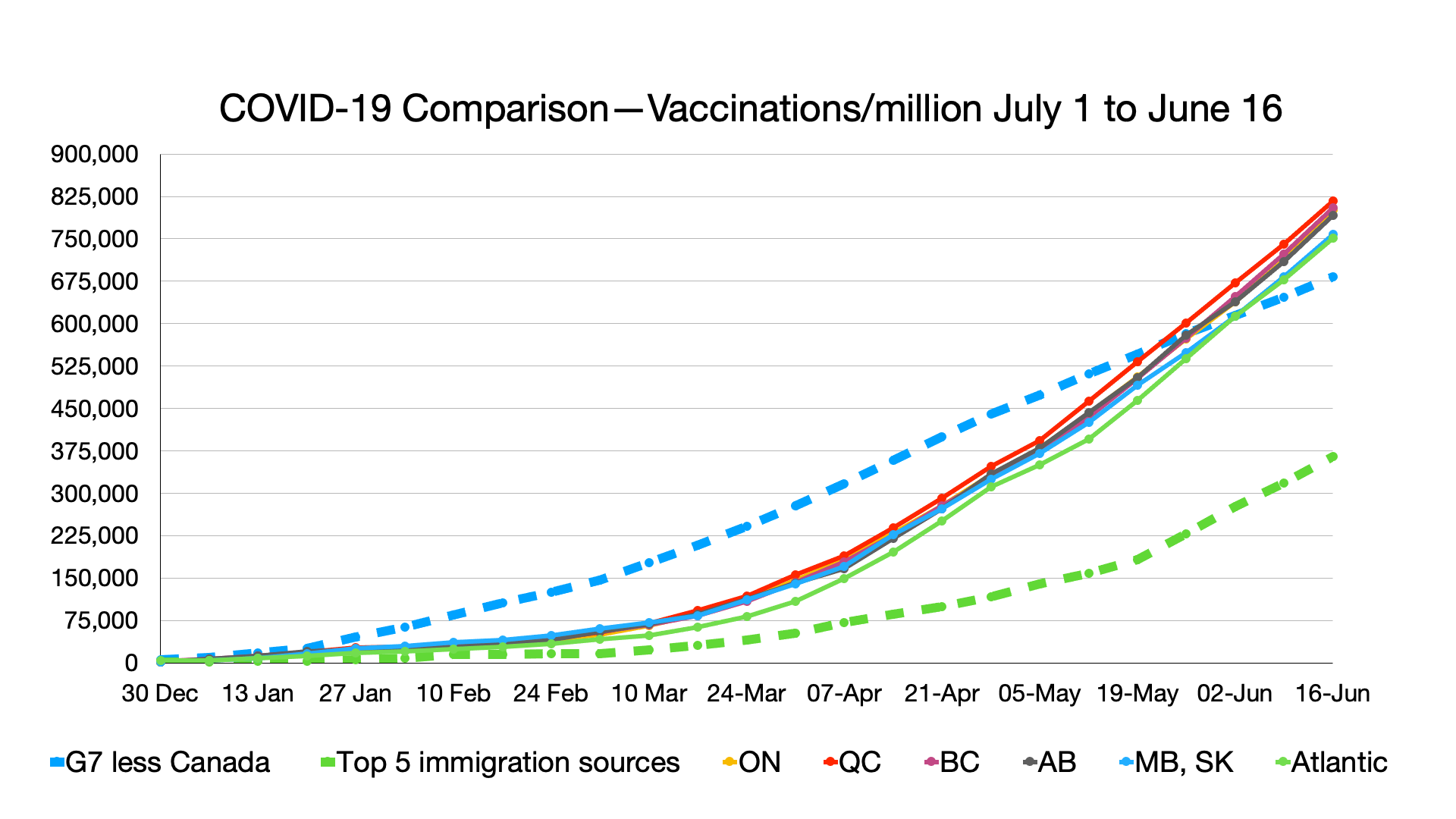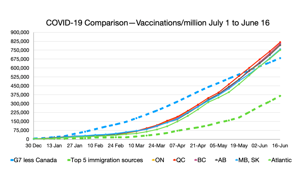 Vaccinations per million: Canadian vaccination rates continue to exceed G7 less Canada with Quebec maintaining its slight lead. Vaccination rate increase in immigration source countries driven by China (up 16% from last week) with Indian vaccination increasing more slowly (10%).