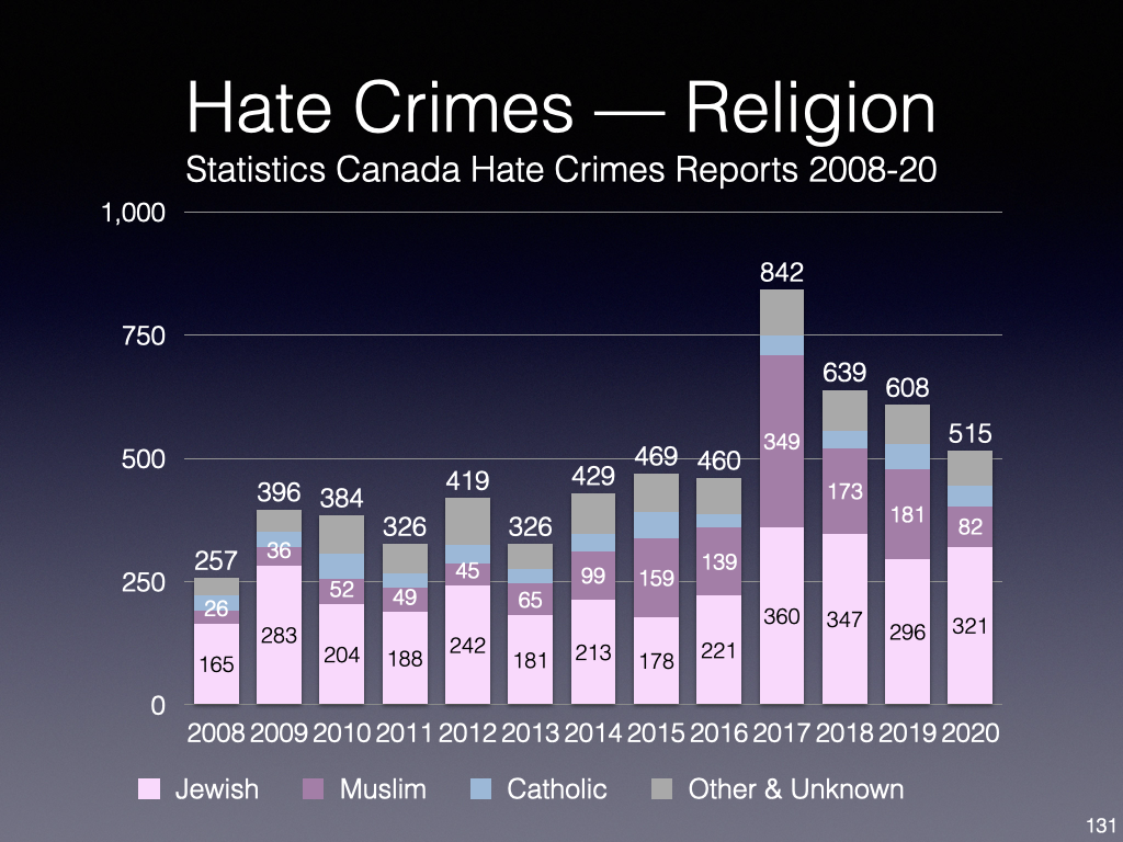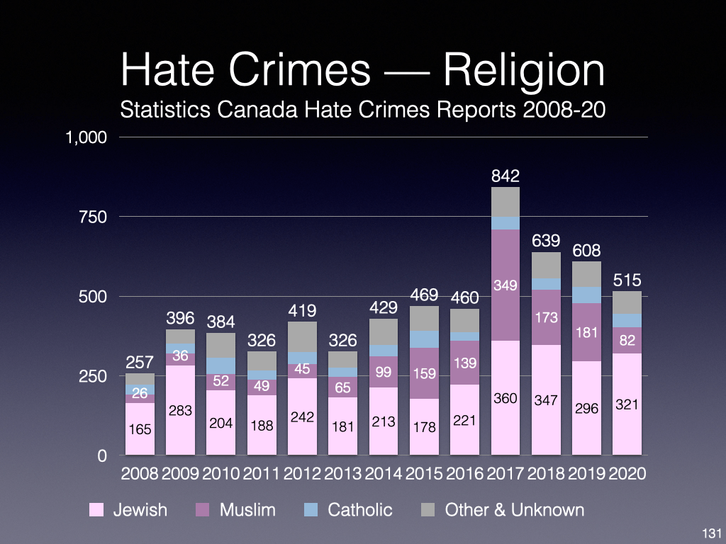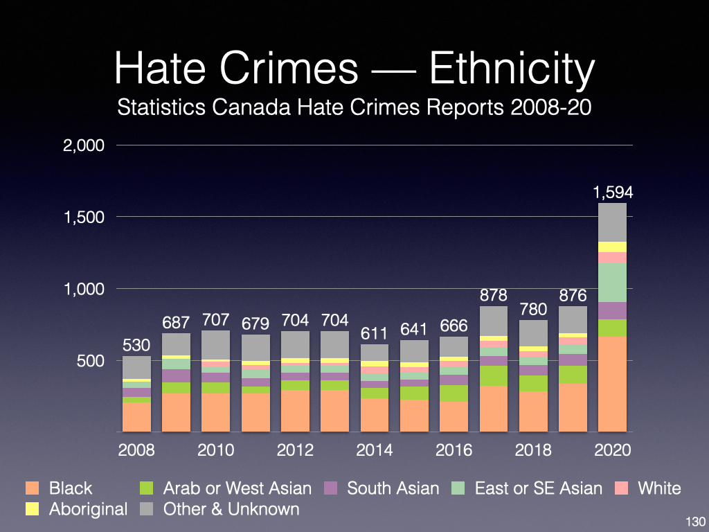 The latest breakdowns, including 2020, with almost a doubling of race and ethnicity-related hate crimes, particularly for East Asians, quadrupling and Blacks, almost doubling from 2019 to 2020.