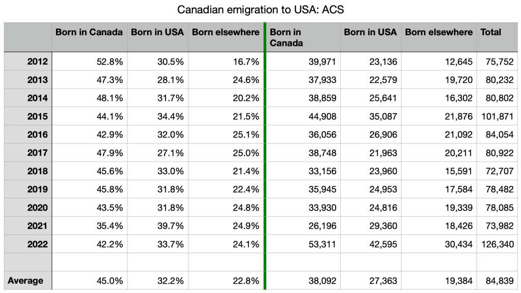 The ration of emigration to the USA to immigration has, however, remained relatively constant: under 30 percent. So while concerning, the rate of churn does not appear to have changed significantly. The respective percentages of born in Canada, born in USA or born elsewhere (the immigrant/emigrant churn) do not appear to have changed significantly even has the overall numbers grew in 2022: