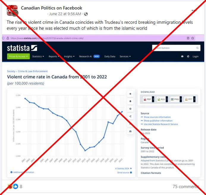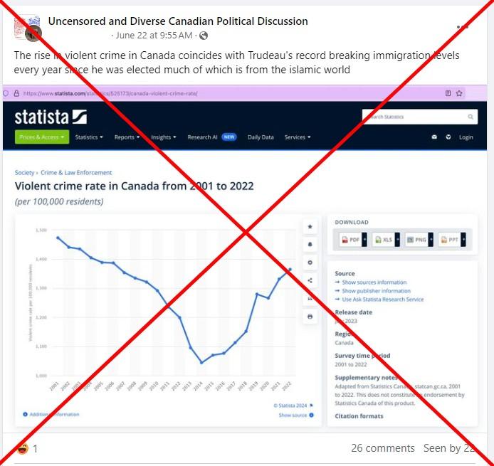 “The rise in violent crime in Canada coincides with Trudeau’s record breaking immigration levels every year since he was elected much of which is from the islamic world,” says a June 22, 2024 Facebook post.