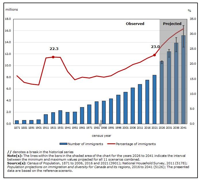 This screenshot taken July 9, 2024 shows a Statistics Canada graph depicting immigration rates from 1871 to 2021, as well as future projections