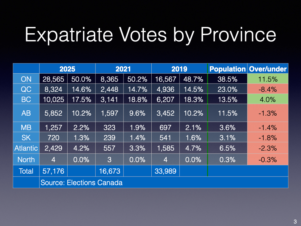 Upcoming analysis on the provincial and country breakdowns for the 2025 election, sample below, Ontario and British Columbia have higher proportions than other provinces: