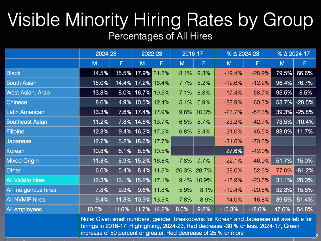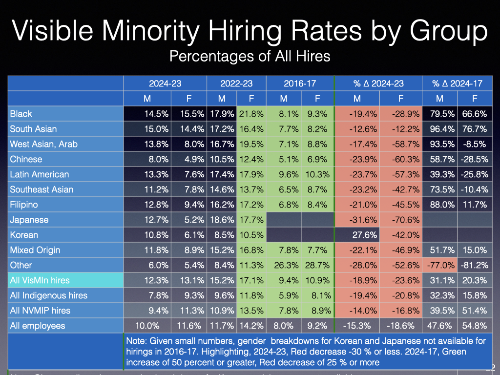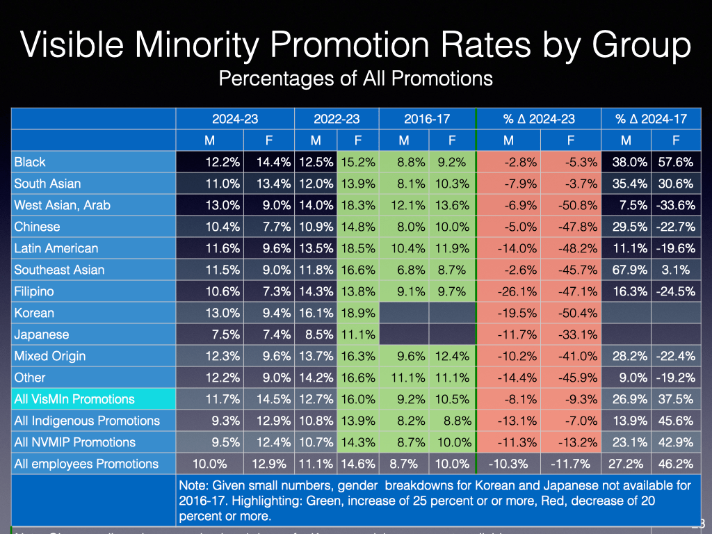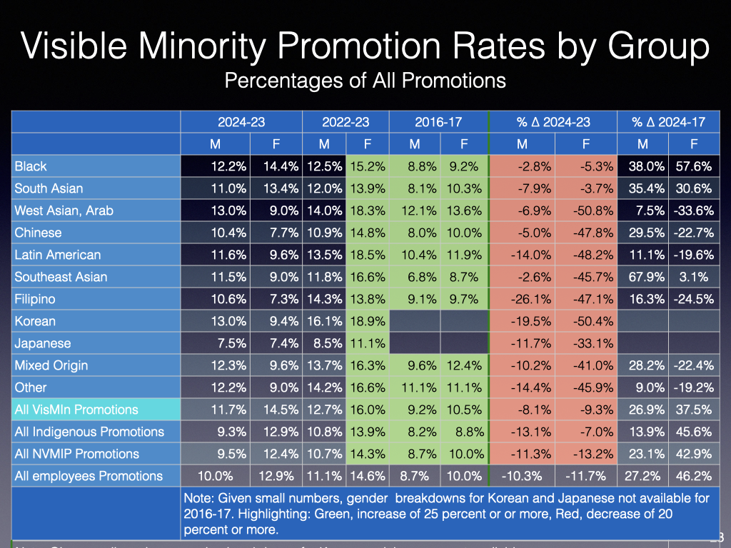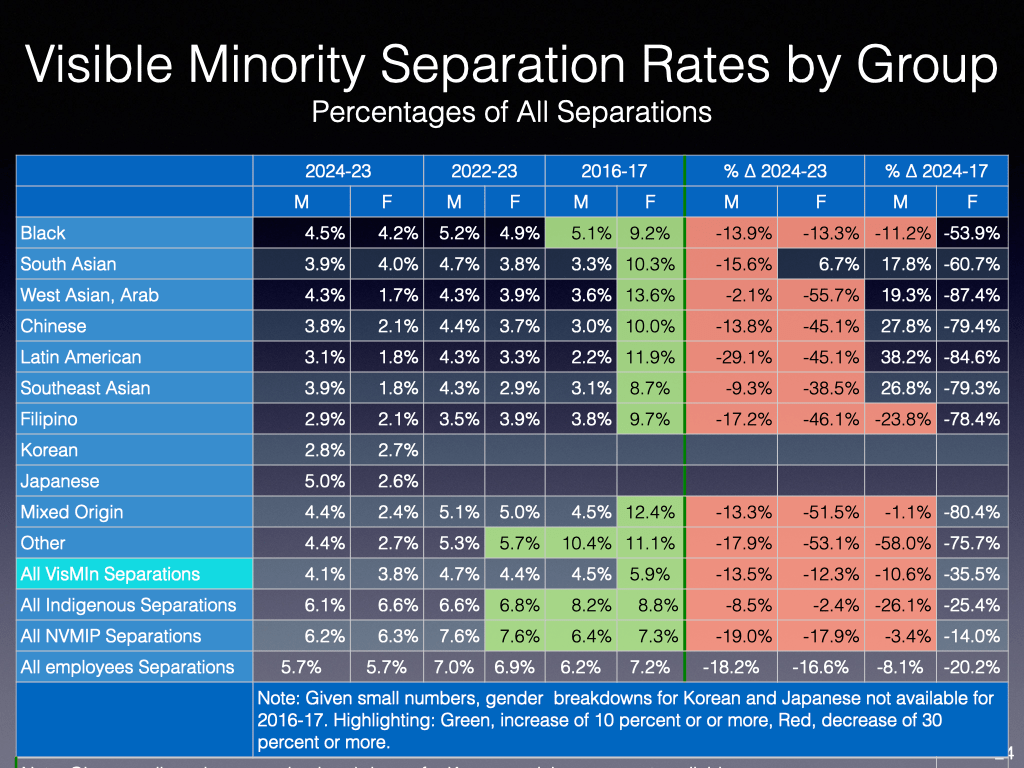 Will be curious to see the respective numbers of hirings, separations and promotions in the forthcoming TBS EE report. Hopefully, TBS will continue to provide the breakdowns by visible minority groups.