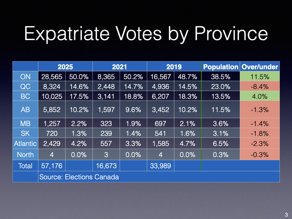 Upcoming analysis on the provincial and country breakdowns for the 2025 election, sample below, Ontario and British Columbia have higher proportions than other provinces: