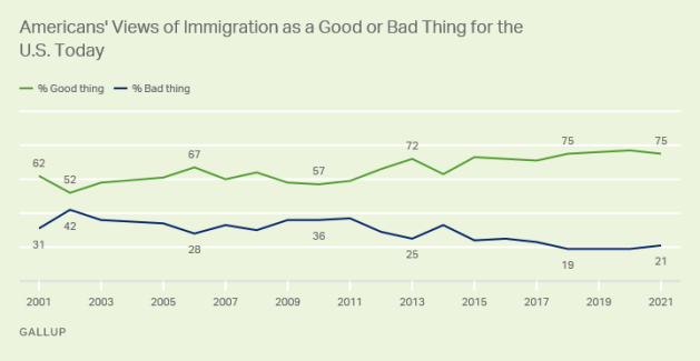 At least seven in 10 Americans have viewed immigration positively since 2015, and majorities have consistently done so since Gallup first asked the question in 2001. At its lowest, 52% said immigration was a good thing in Gallup’s first post-9/11 reading in 2002.