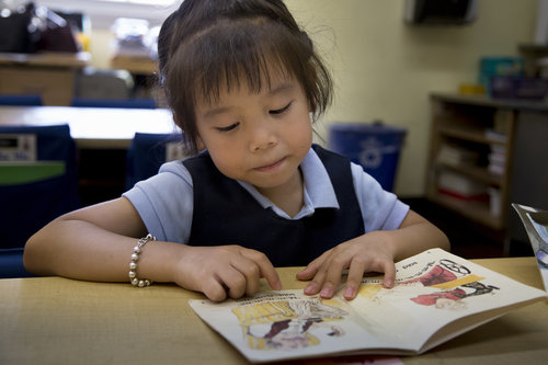 Five-year-old Vivien Huang reads a book in her kindergarten classroom. After being raised in China, her teacher says she’s eagerly learning English from picture books.