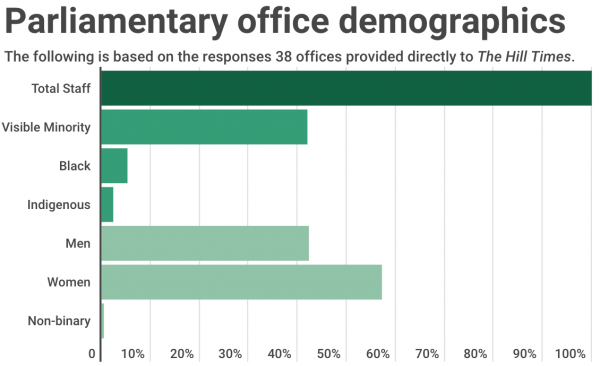 A recent Hill Times survey seeking to understand the demographics of staff on Parliament Hill found that, among a small pool of respondent MP offices, 42 per cent of staff identified as a visible minority, while 5.3 per cent identified as Black, but a comparison to cabinet offices, including the Prime Minister’s Office, isn’t possible after a separate survey was circulated by the PMO that excluded a specific category on staffers who identified as Black.