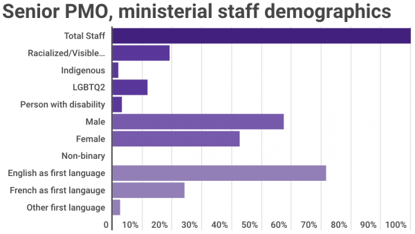 Picking out the PMO specifically, the office reports that 29.9 per cent of its staff self-identified as racialized/visible minority/a person of colour and 1.1 per cent as Indigenous; 52.9 per cent identified as male and 47.1 per cent as female; 3.4 per cent identified as a person with a disability; 12.6 per cent as LGBTQ2; and 69 per cent identified English as their first language, while 25.3 said French, and 4.6 said another language.