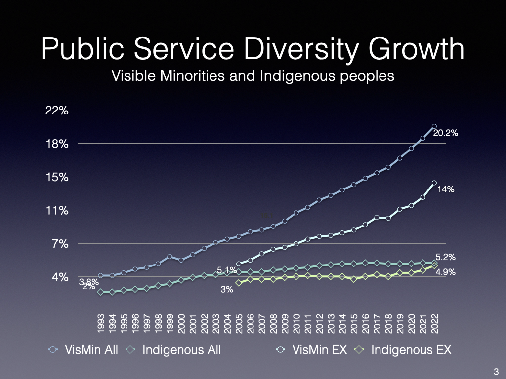 For Thompson to claim that PCO is not providing the numbers, these are available in Table 1 in the annual reports, albeit not disaggregated by visible minority or indigenous group or level.