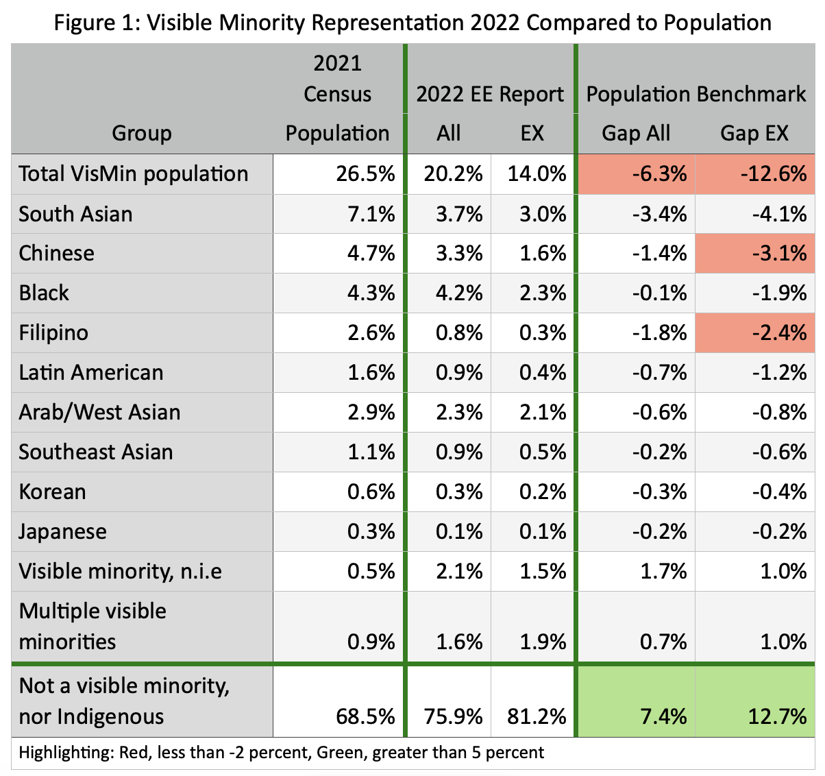 Given the relatively large numbers (March 2023, 252 visible minority employees, or 22.8 percent), it should be possible to request and obtain disaggregated numbers for most groups, and for the larger groups, executives):