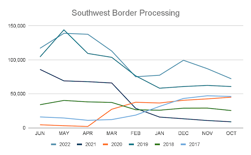 Indeed, the number of people that CBP is processing now is comparable to FY 2019, before the implementation of Title 42 in response to the pandemic. There is only an eight percent difference in the number of people processed in FY19 compared to FY22. In February and May, the Trump administration processed more people in FY19 than the Biden administration in FY22.