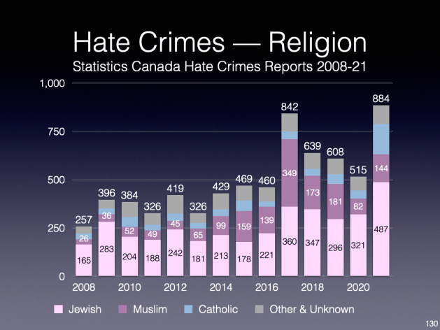 But, for puzzling reasons, neither politicians nor most media mentioned that, while hate crimes against Blacks went down by five per cent and up 16 per cent against Chinese and other East Asians, attacks on Catholics rose by far the most — by an astonishing 260 per cent.While it’s true police hate statistics are notoriously subject to variabilitydepending on who chooses to file complaints, and that Black people and Jews reported a higher total number of incidents than Catholics, it is still news that anti-Catholic hate crimes increased 10 times faster than overall. Statistics Canada offered no comment on why there was an eruption of attacks on Catholic buildings and people, nor did it distinguish between severity of incidents. But the Catholic media has speculated the arsons and vandalism relate to the 2021 announcements of discoveries of potential unmarked graves of Indigenous residential-school students.