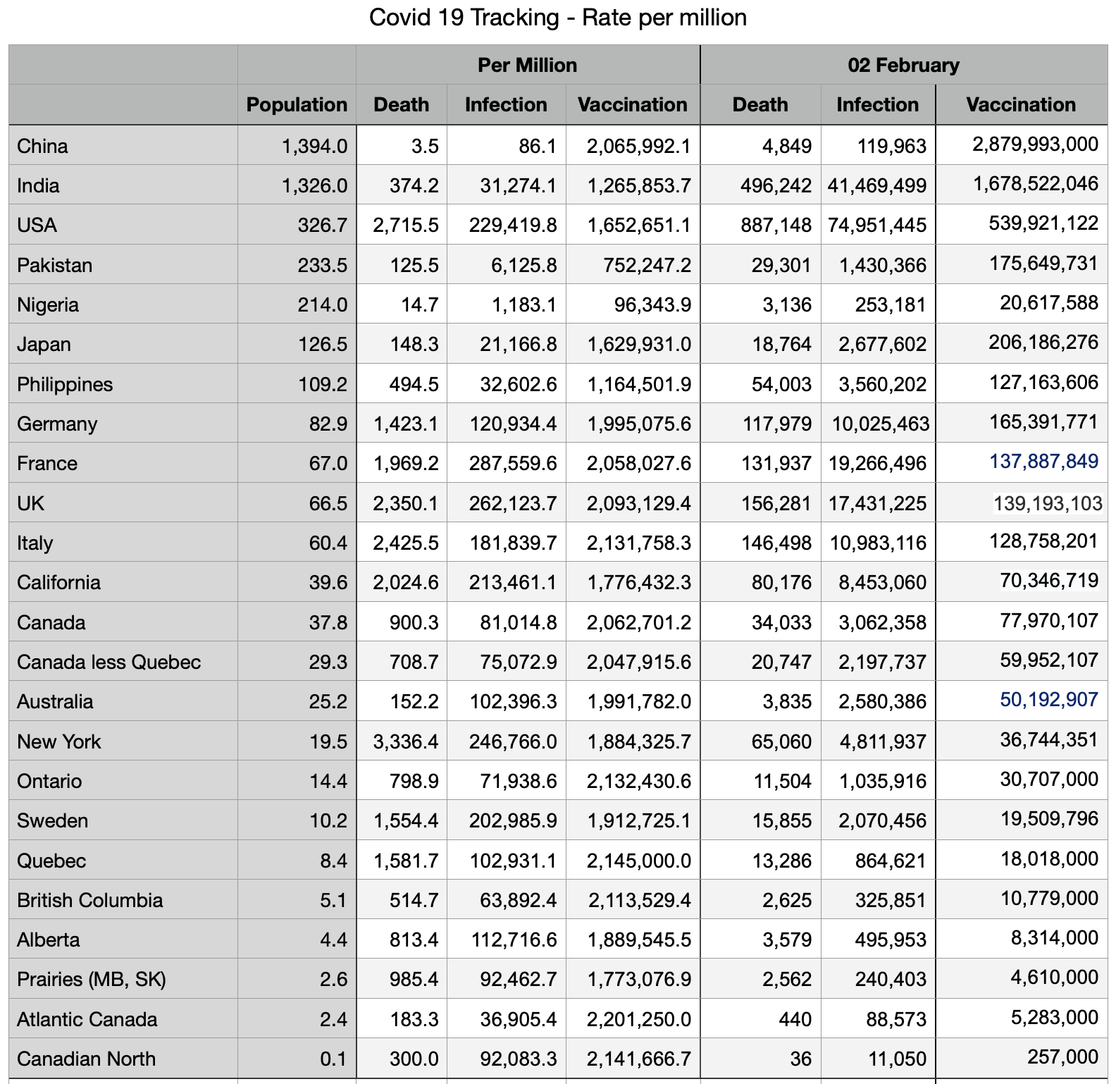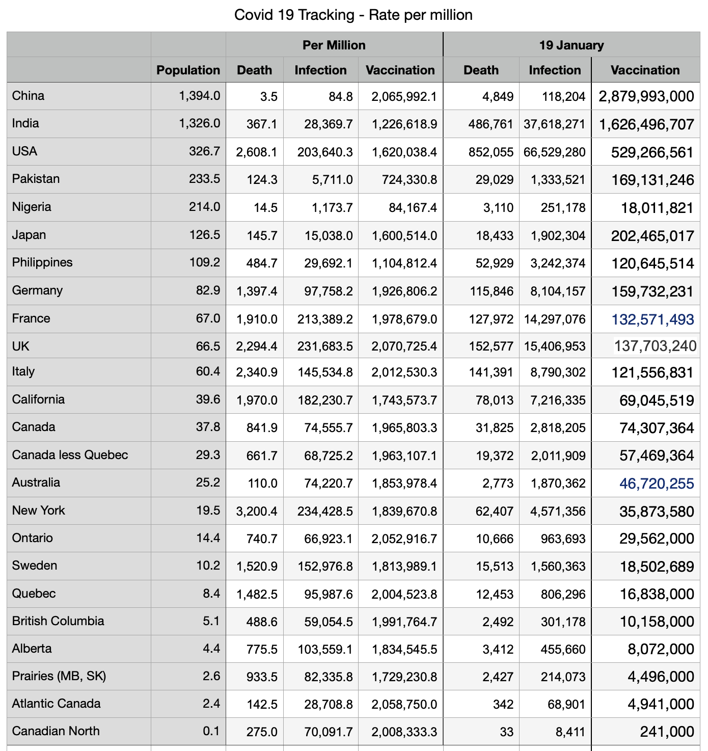 Vaccinations: Minor shifts: Ontario ahead of Italy and Quebec, Sweden ahead of Alberta, Australia, New York and Japan. China fully vaccinated 79.5 percent, India 35.6 percent, Nigeria 1.9 percent, Pakistan 24.5 percent, Philippines 35.8 percent.