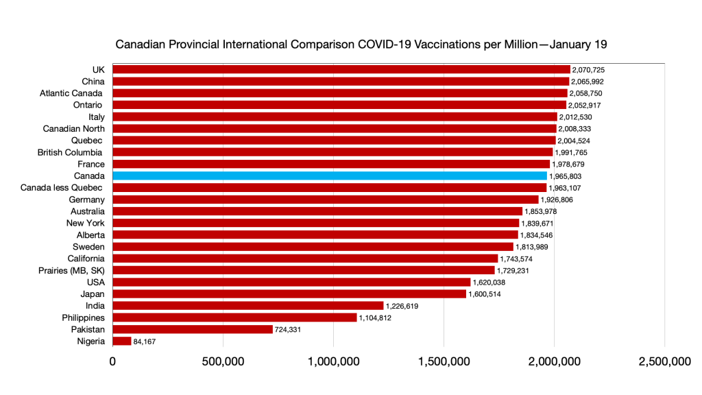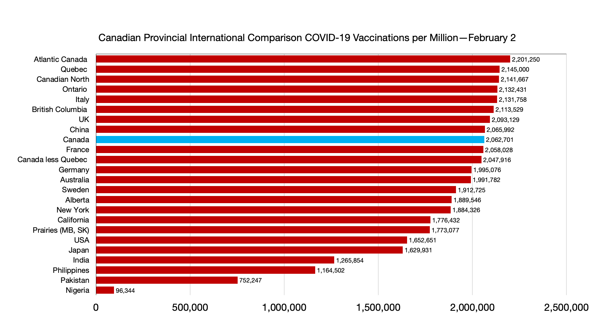 Vaccinations: Minor shifts: British Columbia ahead of Atlantic Canada, France ahead of Alberta and Japan, New York and California ahead of Prairies. China fully vaccinated 77 percent, India 32.8 percent, Nigeria 1.7 percent, Pakistan 23.2 percent, Philippines 33.6 percent.