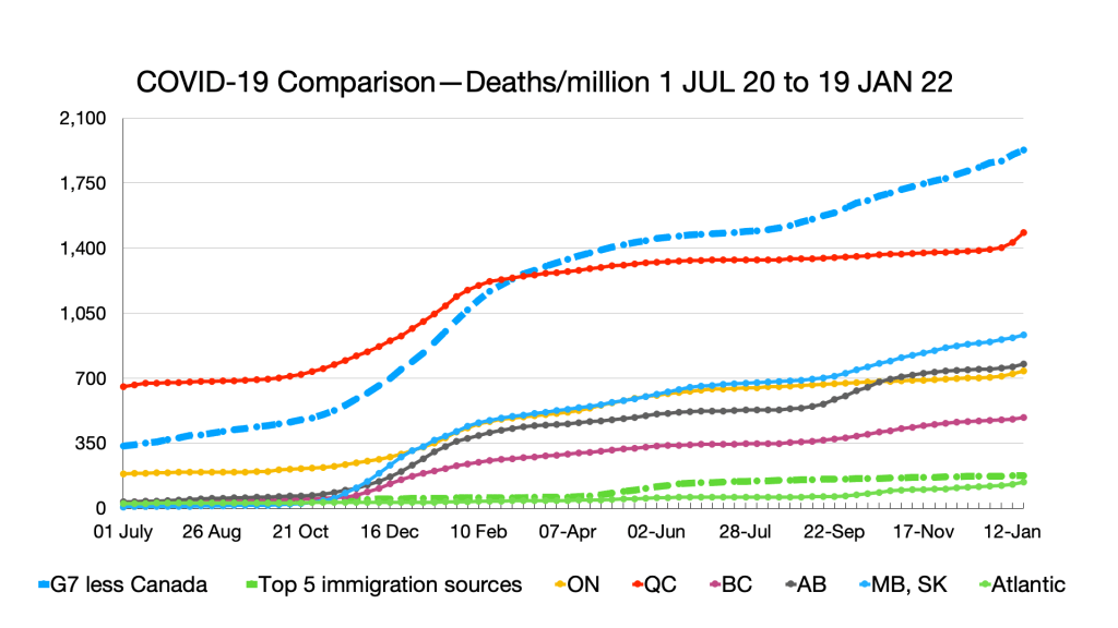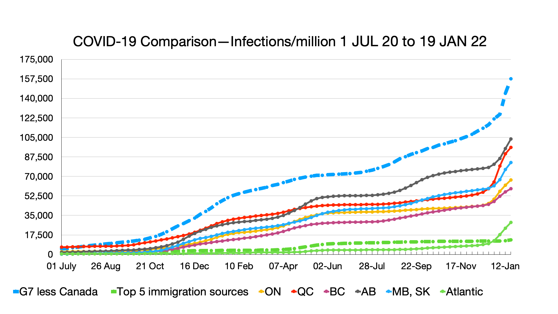 Infections: Effects of Omicron seen in steep curve in all G7 countries and provinces. No such effect in immigration source countries
