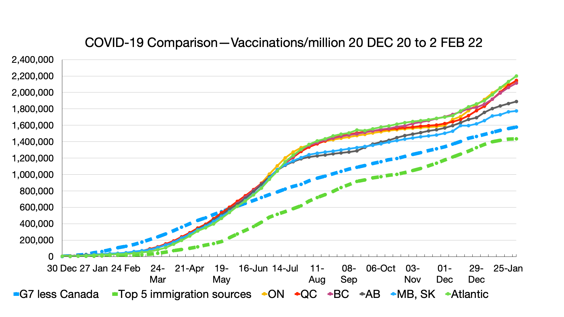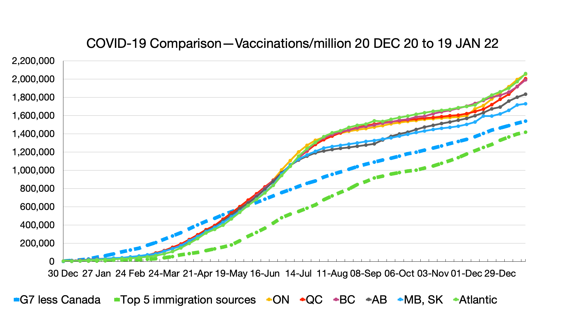 Vaccinations: Ongoing convergence among most provinces. Gap between G7 less Canada continues to grow despite overall convergence, with narrowing gap with immigration source countries save for Nigeria.