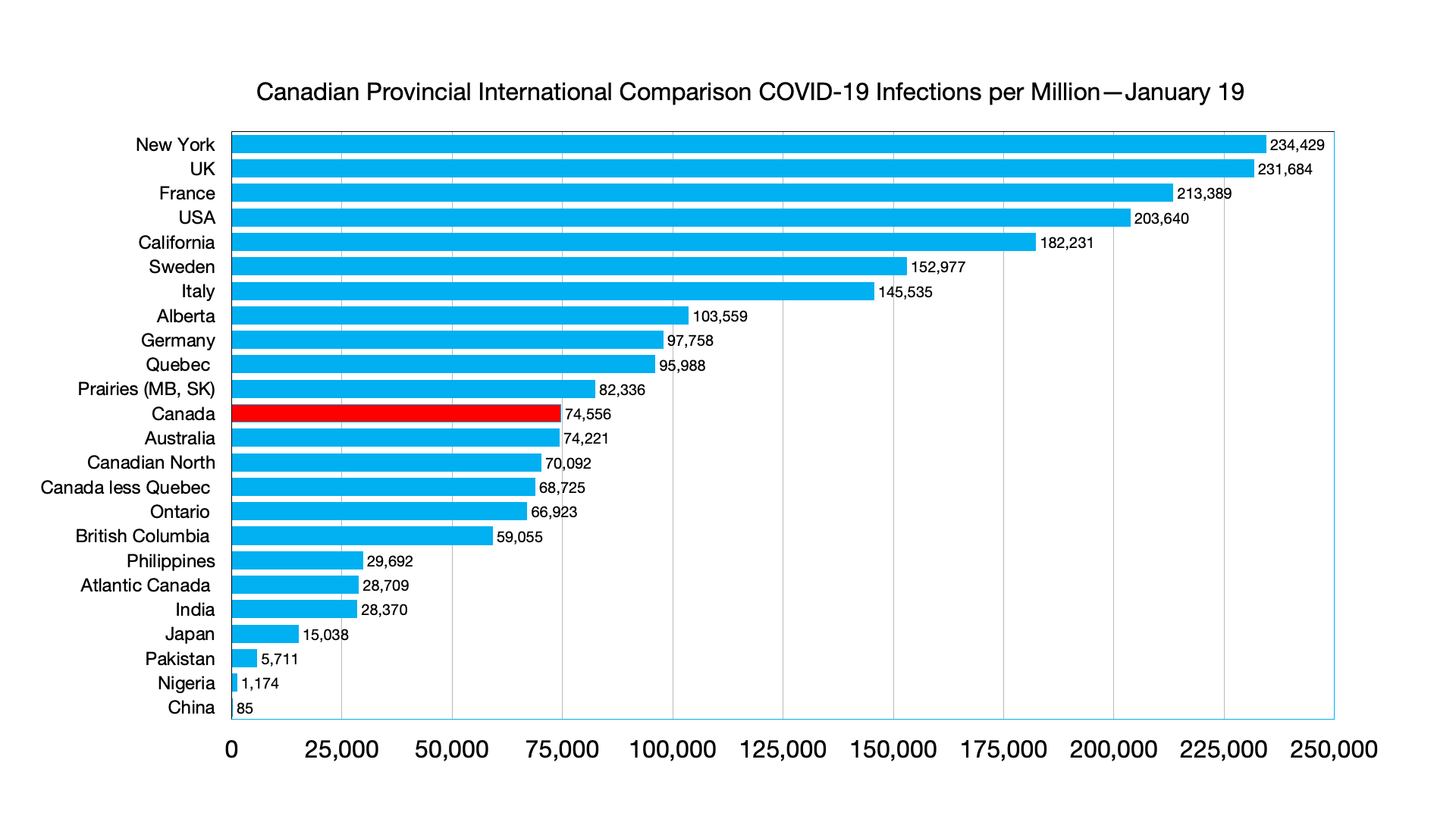 Infections: New York ahead of UK, France ahead of USA, Australia ahead of Canada less Quebec, Atlantic Canada ahead of India.