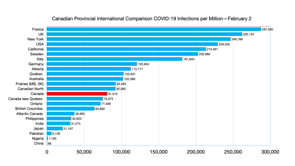 Infections: France ahead of New York and UK, Australia ahead of Prairies, Atlantic Canada ahead of Philippines.