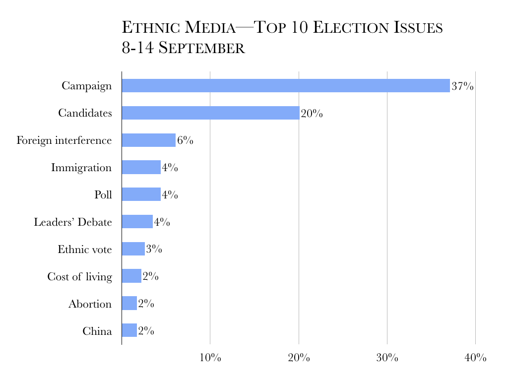Latest weekly analysis of ethnic media coverage. For the analytical narrative, go to Ethnic media election coverage 8-14 September: