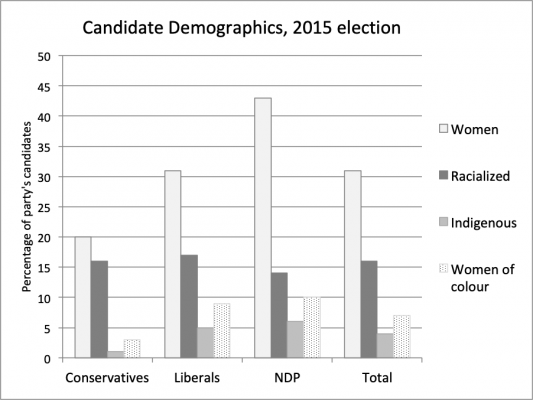 Parties are not obligated to release data on the diversity of their candidate slates, so researchers and journalists are left to tally the statistics. They do this by consulting candidate biographies and other publicly available information, but even then, it’s hard to compile a full picture beyond the three main parties. In 2015, our best estimates suggest that at least 80 per cent of candidates were white, and 70 per cent were men.