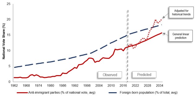 Figure 1: Immigrants and observed/predicted future support for anti-immigration parties in Western Europe (1962-2035)