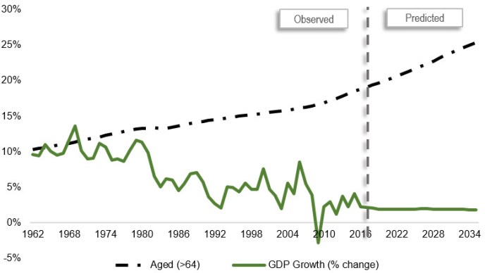 Figure 2: Ageing population figures and observed/predicted GDP growth in Western Europe (1962-2035)