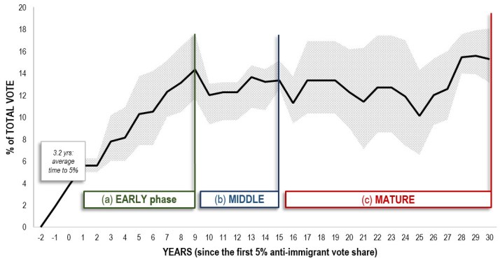 The most conservative prediction suggests that the vote share for such parties will cross 15% by 2035, as shown by the solid red line in Figure 1. However, the development of this support follows distinct phases. After an anti-immigration party enters the political arena and acquires support, the average time before it gains 5% of the national vote is 3.2 years (albeit with a large variance). After this 5% threshold is met, anti-immigration parties follow a trajectory of swift gains in the early phase (within 10 years of crossing the 5% mark), stability if not turbulence in the middle phase (up to 15 years) and then ultimately more gains in the mature phase (up to 30 years) as sown in Figure 3.