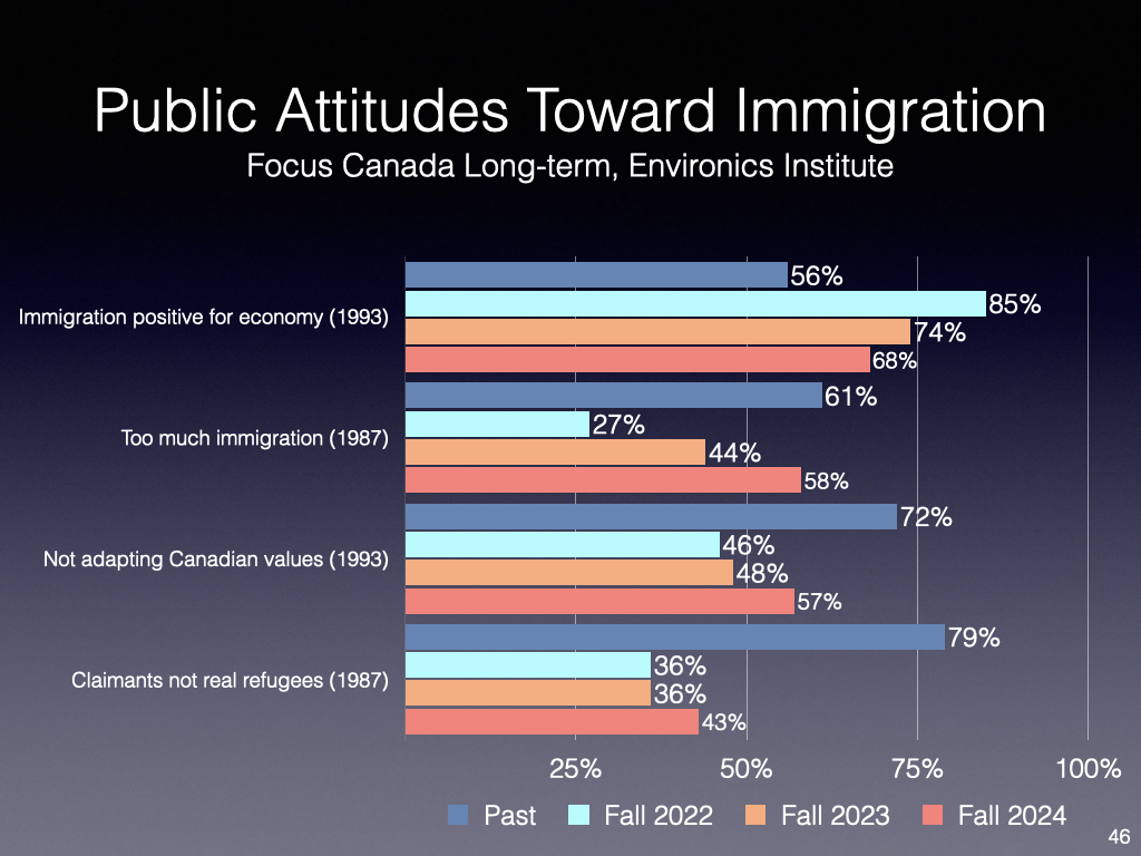 Clear continuing signs of an inflection point in attitudes, reflecting overly high levels of permanent residents and out of control temporary (students, foreign workers) along with impact on housing availability and affordability.