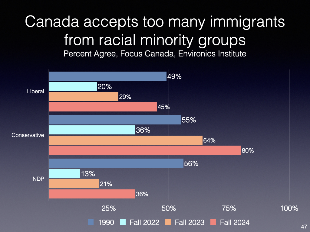 The good news is that for most questions, the decline in support has largely bottomed out. Encouraging that concerns revolve more around immigration program mismanagement and impact on housing, healthcare etc rather than values albeit latter along with refugees and crime remain issues. Partisan differences have increased significantly, likely reflecting Conservative highlighting immigration and citizenship issues and possible influence of USA debates: