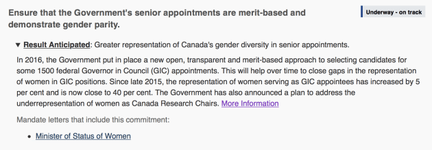 As indicated online, the “new approach will” require all GIC opportunities to be advertised online, as well as in the Canada Gazette, and GIC candidates will complete an online profile of their personal background (including language and identity group) in order to try to ensure diversity in appointments.