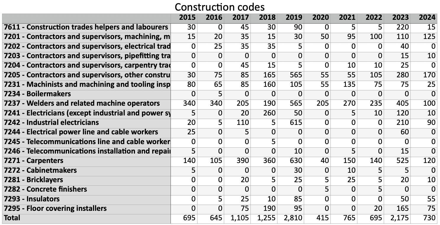 Unfortunately, Olsen didn’t check the data (Temporary Residents: Temporary Foreign Worker Program (TFWP) and International Mobility Program (IMP) Work Permit Holders – Monthly IRCC Updates – Canada – International Mobility Program work permit holders by province/territory, intended occupation (4-digit NOC 2011) and year in which permit(s) became effective). Had some time to look at the construction sector, highlighting that there has been an increase at the supervisory level (B):