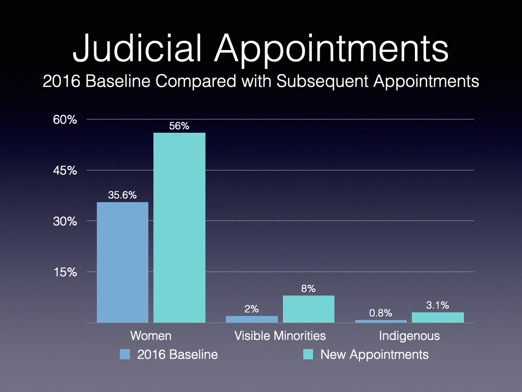 Significant. In contrast, my analysis of judicial appointments under the Liberal government (close to 500 appointments, 55.7 percent women, 8.5 percent visible minorities, 3.1 percent Indigenous):