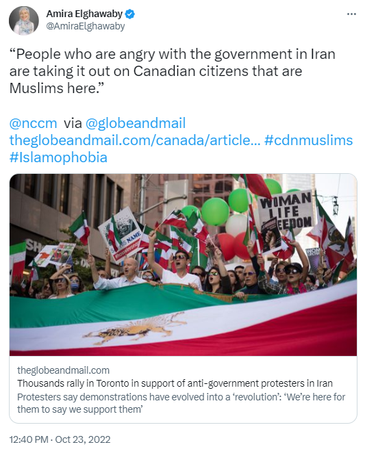 Interestingly, there has also been some pushback by members of the Iranian Canadian community, partly driven by their visceral reaction to the hijab, given that the Iranian regime forced it on women and the recent protests against the mandatory hijab and regime. Kaveh Shirooz has been active on twitter pointing out that Elghawaby has argued that “People who are angry with the government in Iran are taking it out on Canadian citizens that are Muslims here,” rather than criticizing the Iranian regime for its repression (Google search does not show any other commentary on the Iran protests unless I missed it).