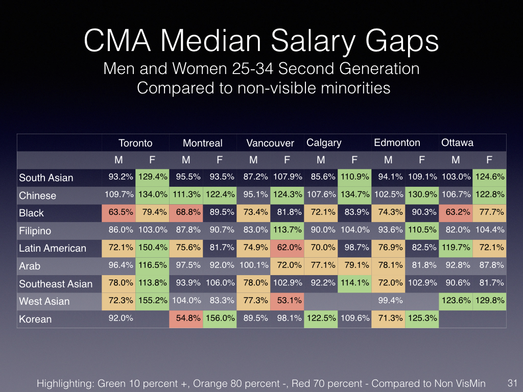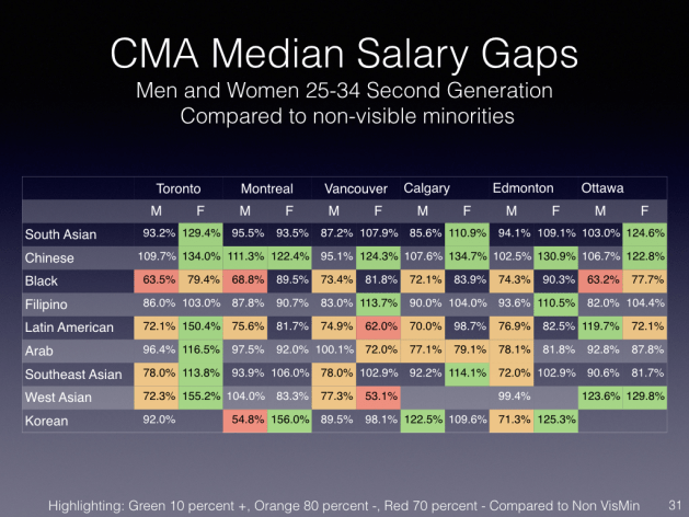 But that data doesn’t incorporate filters around identity and background of women, an omission that effectively erases the compounding discrimination faced by non-white women in Canada. A lens that compares only men and women sets up women’s rights as a replica of patriarchy, where one group is favoured over everyone else; in doing so it reinforces the rigid power structures that have brought us to this point. But including race in the analysis reveals a different kind of gender gap that’s perhaps even more alarming than the broader issue.