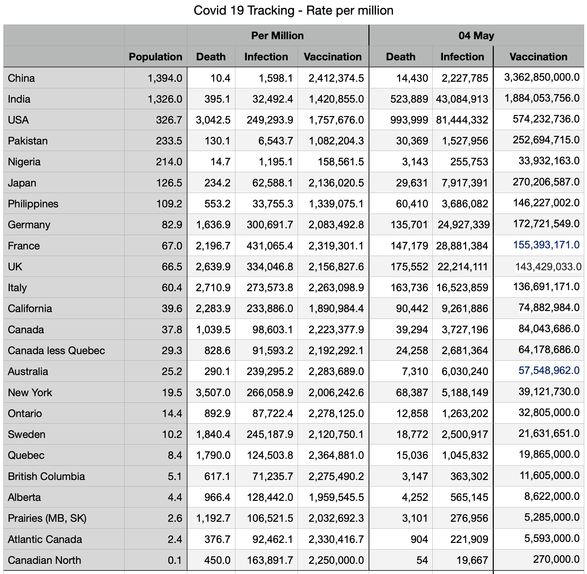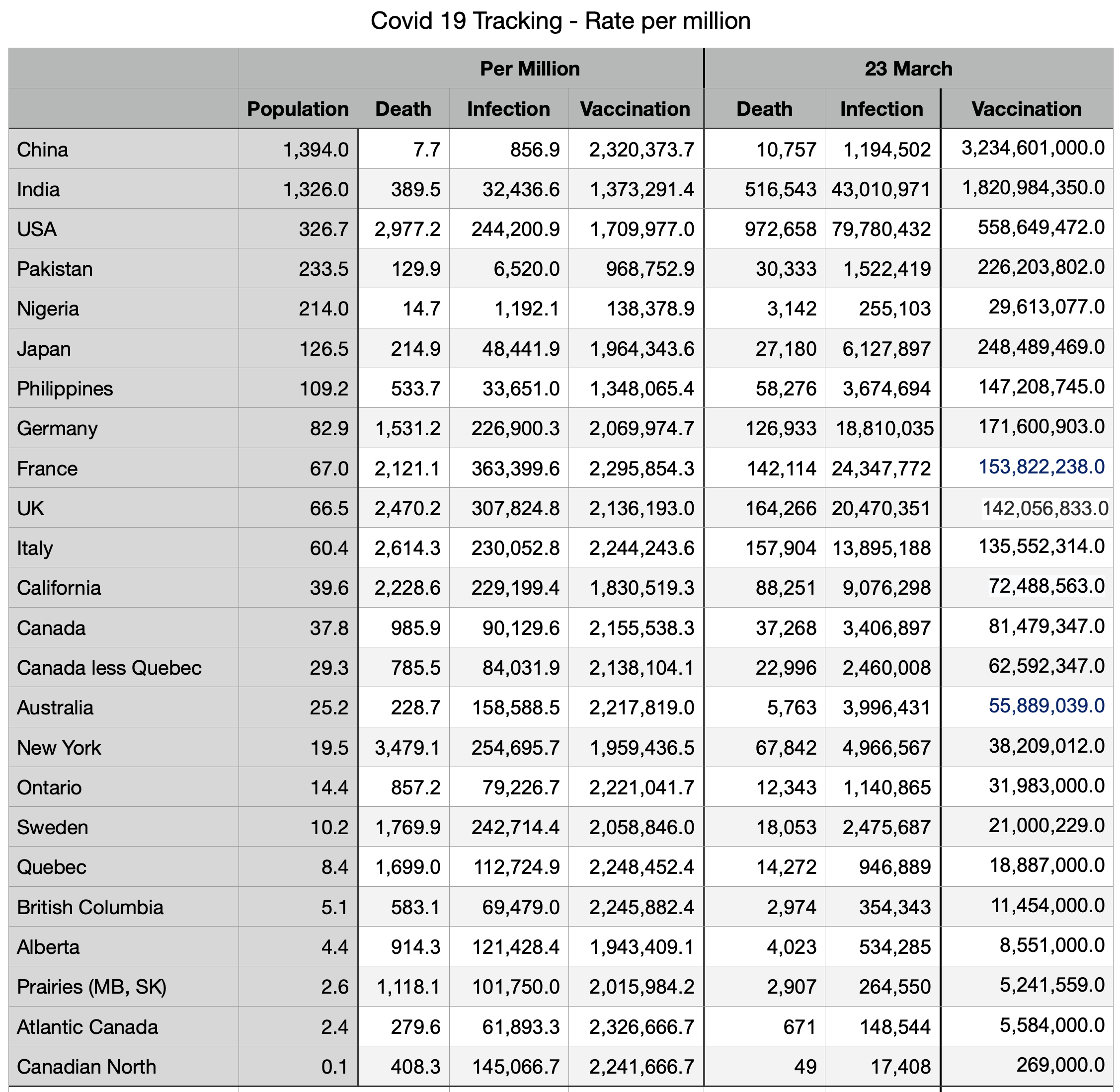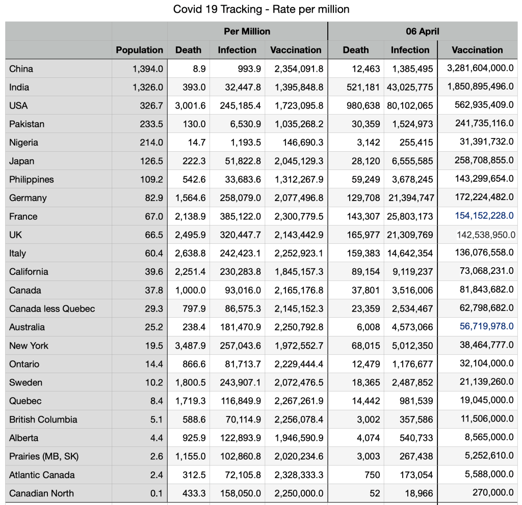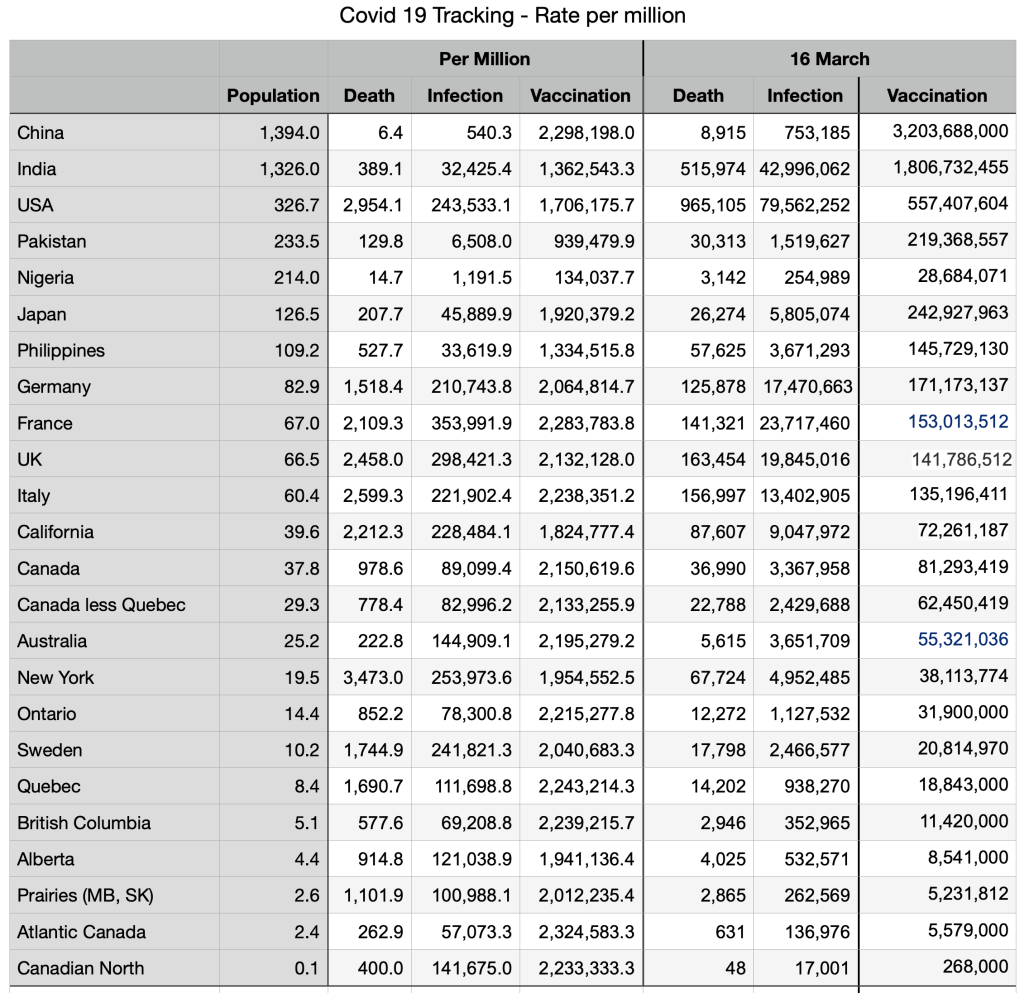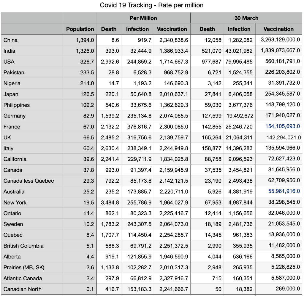 Deaths: Major change again is with respect to China with deaths per million increasing from 3.5 to 3.9. Sweden is now ahead of Quebec.