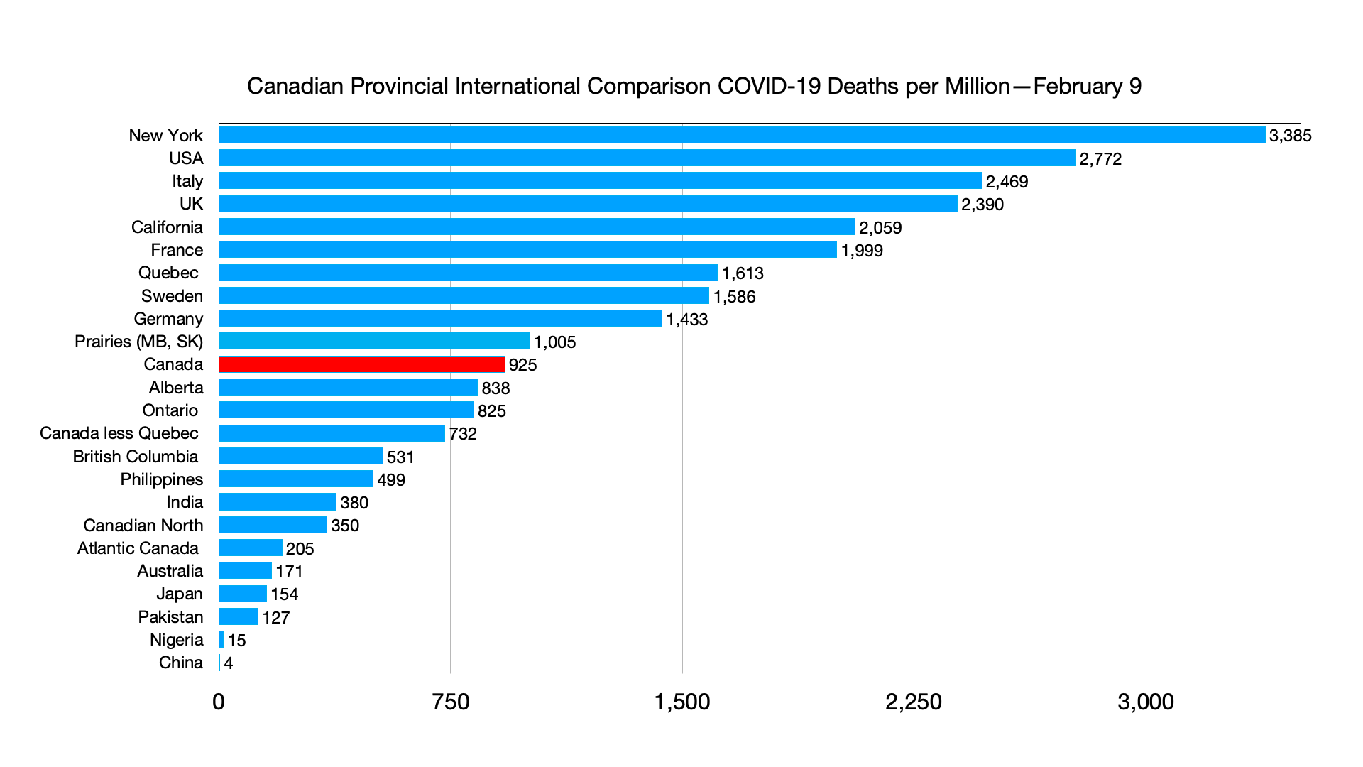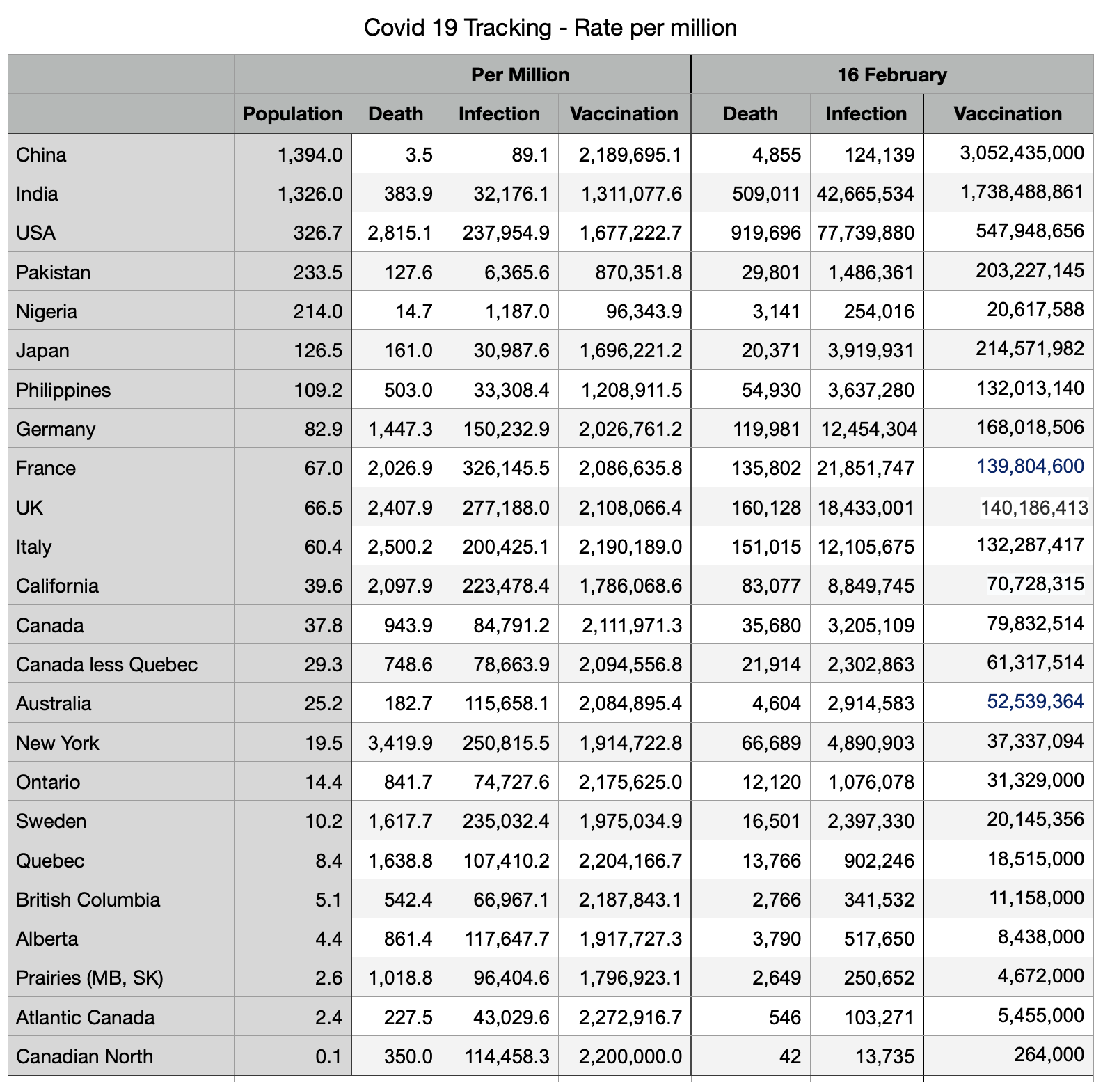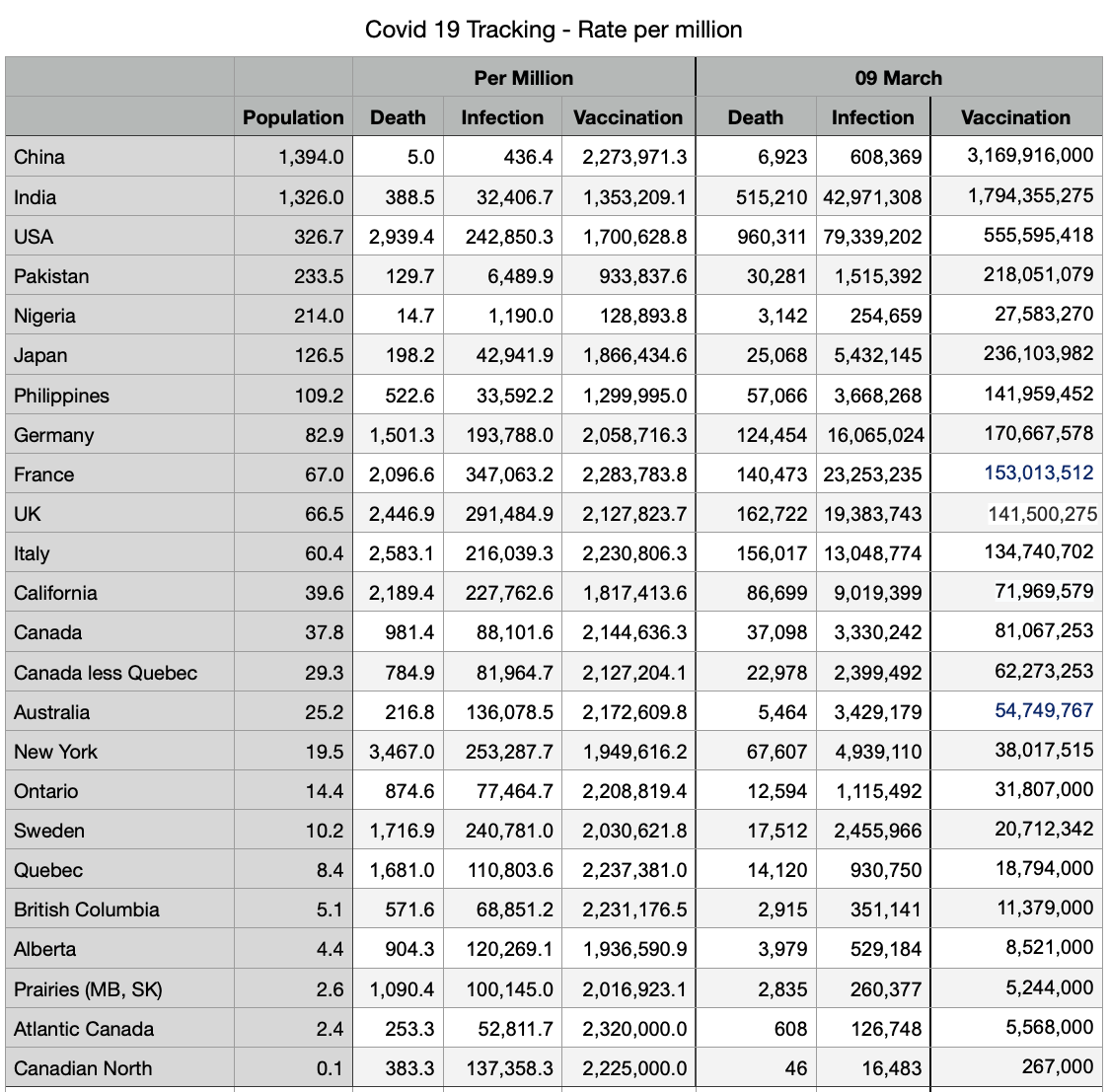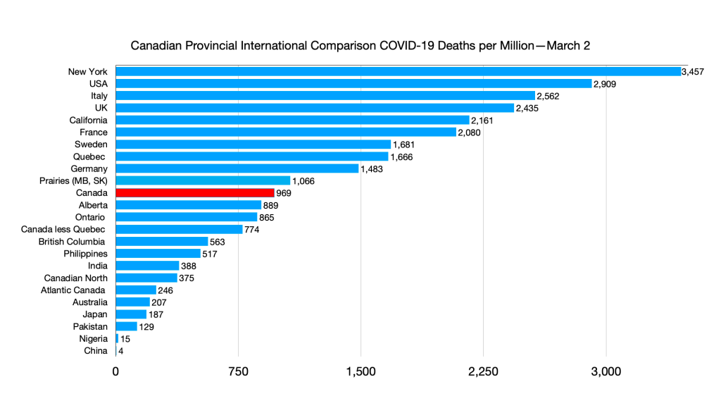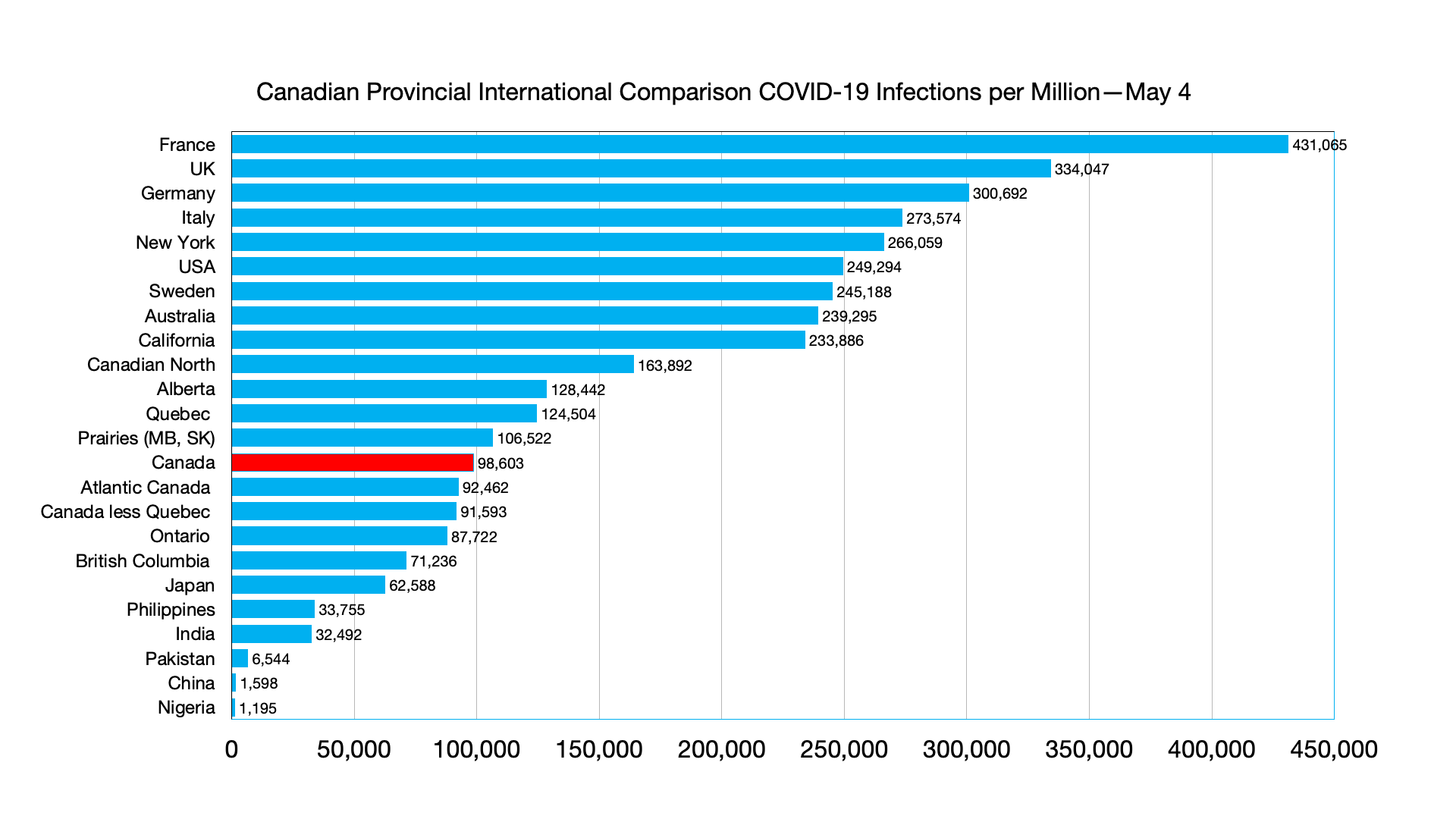 Deaths: Major change again is with respect to China with deaths per million increasing from 3.5 to 3.9. Sweden is now ahead of Quebec.