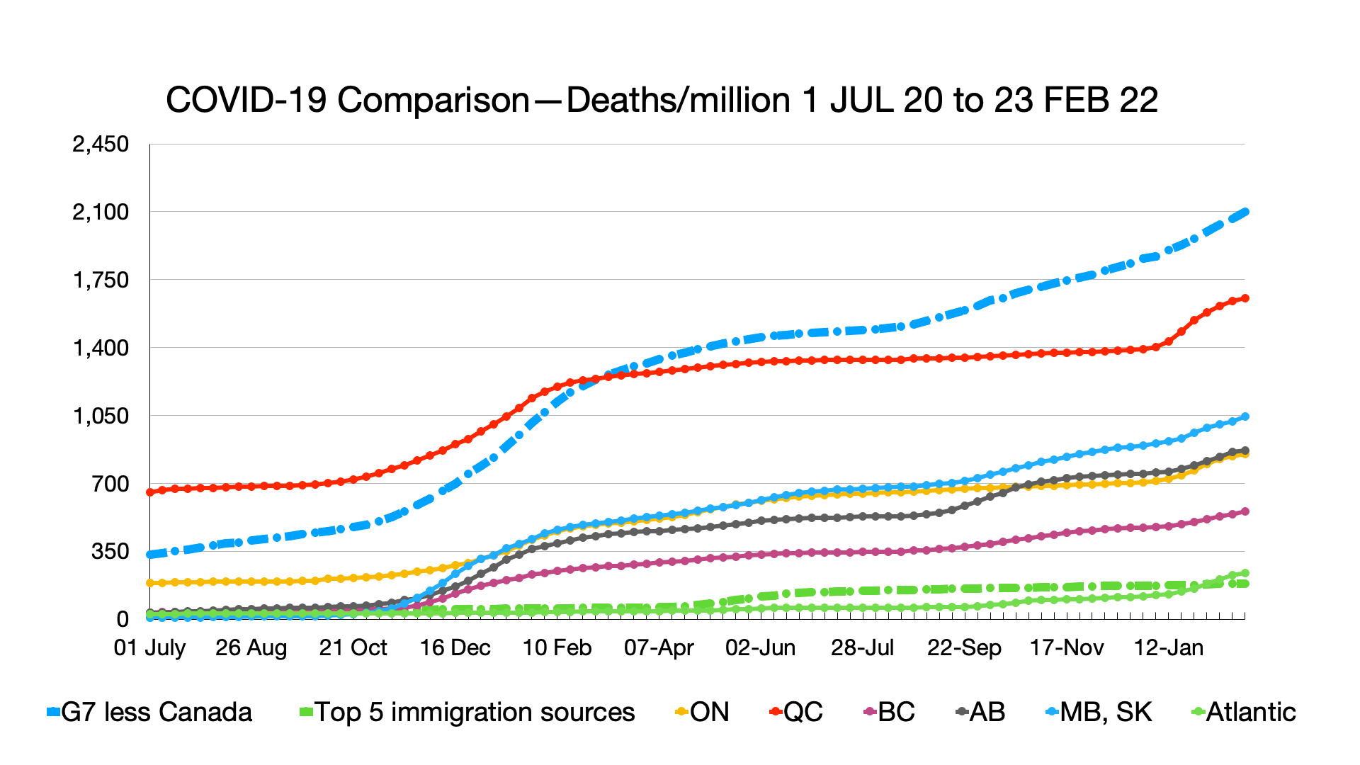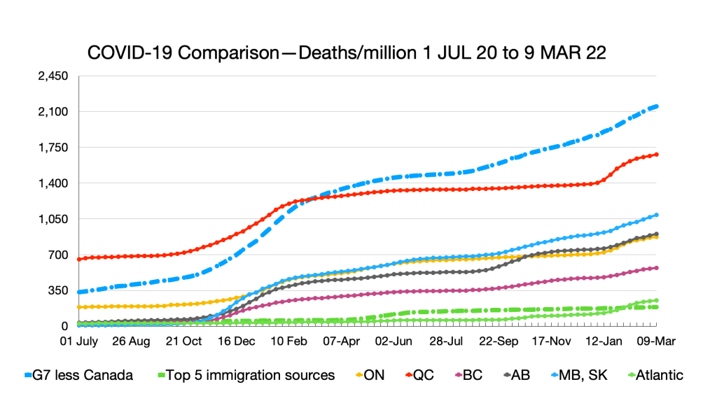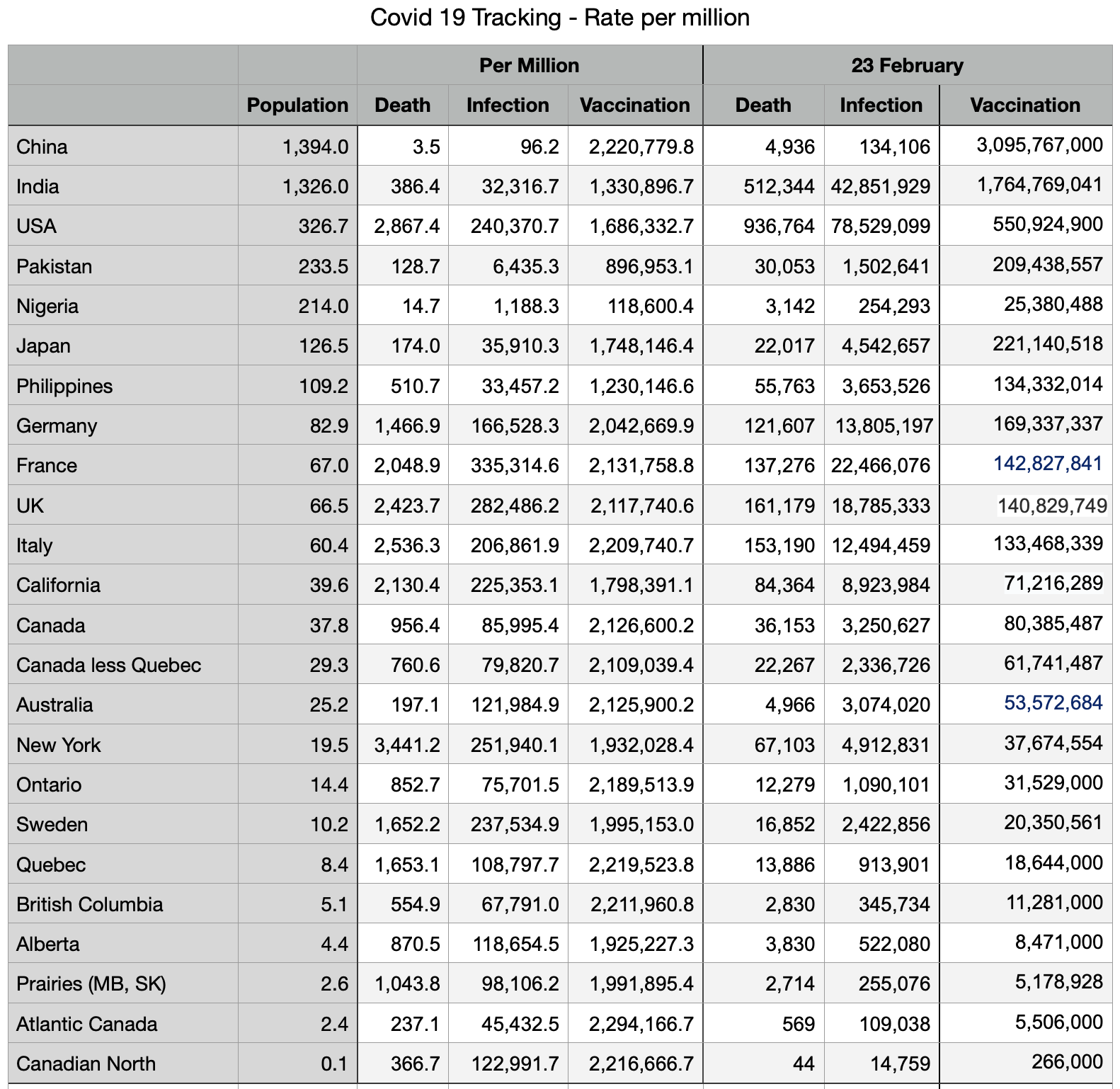 Overall decline in infections and deaths as omicron wave passes. Note Saskatchewan data is from previous Thursday given the government’s “see no evil” strategy of no longer publishing daily statistics.