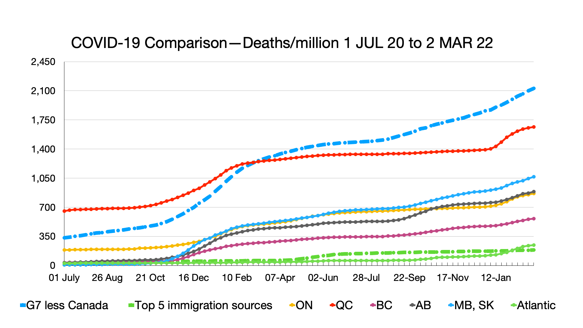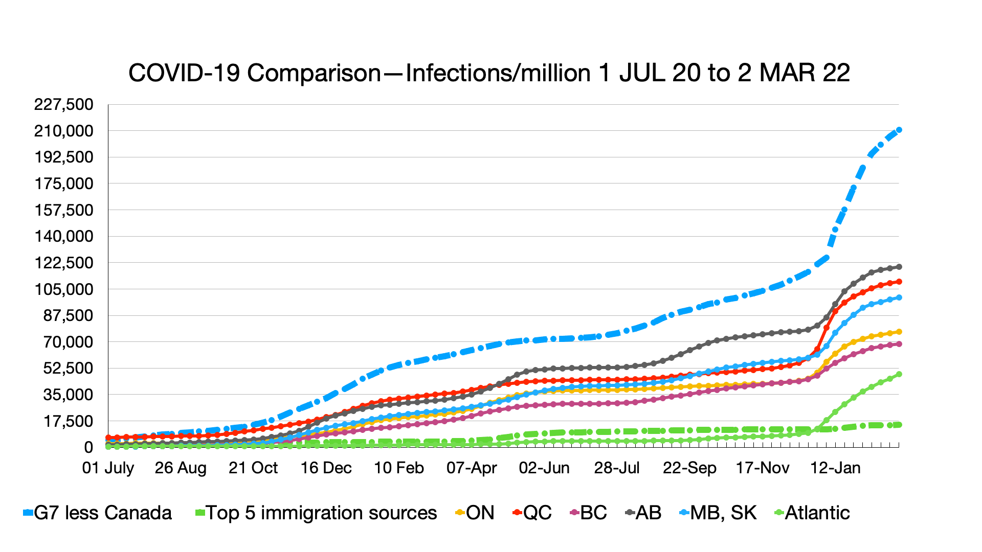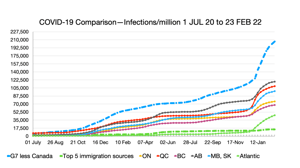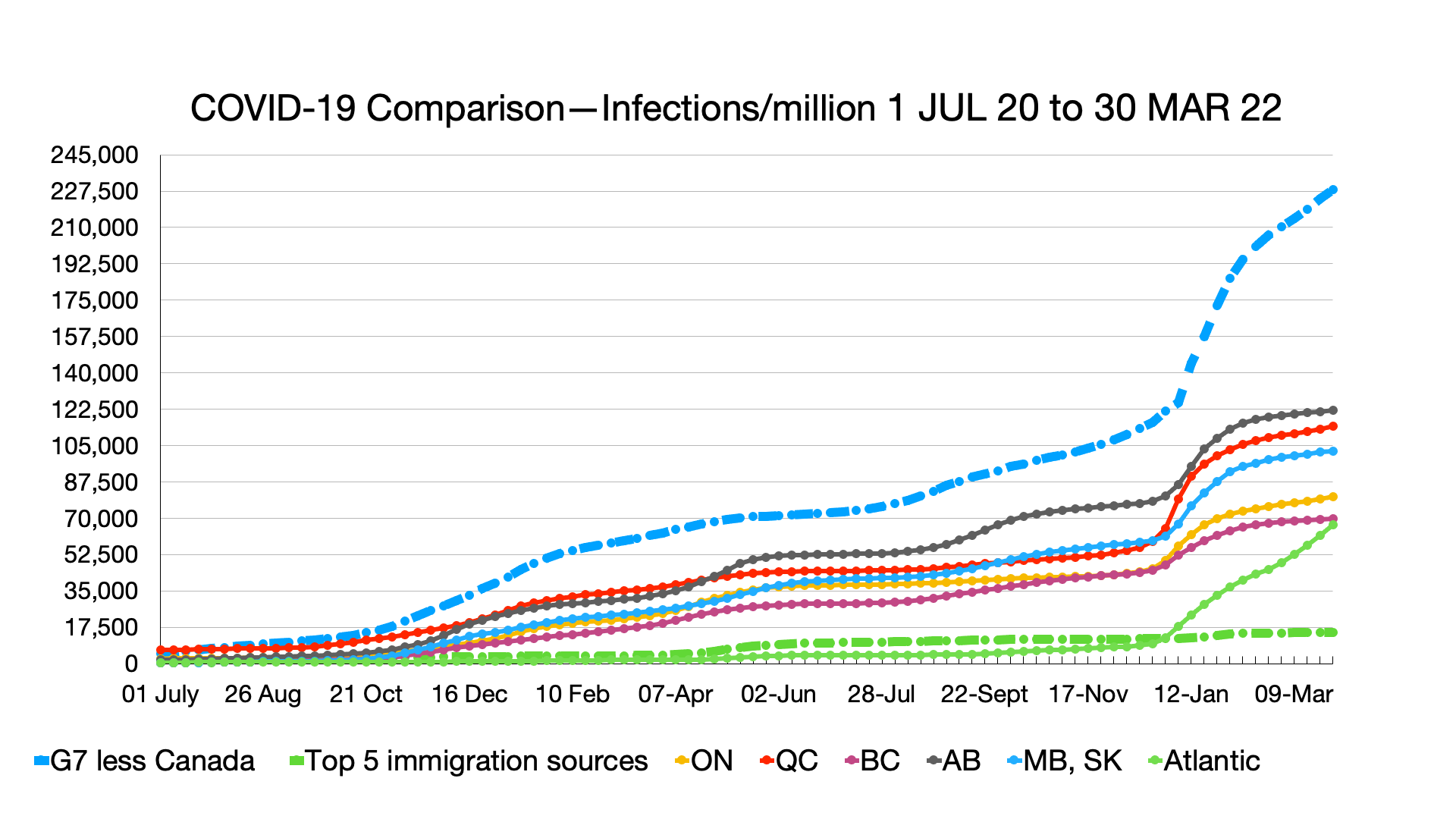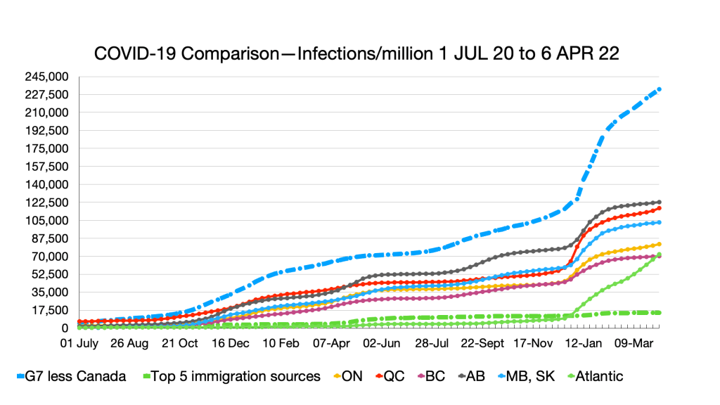 Infections: Increased number of infections due to omicron variant in G7 countries with most Canadian provinces having lower rates of increase save for Atlantic Canada.
