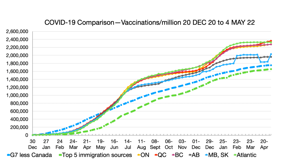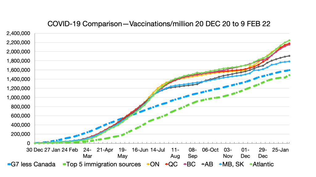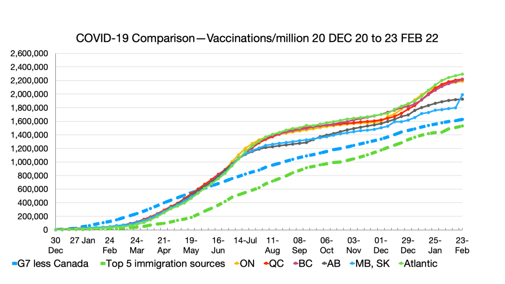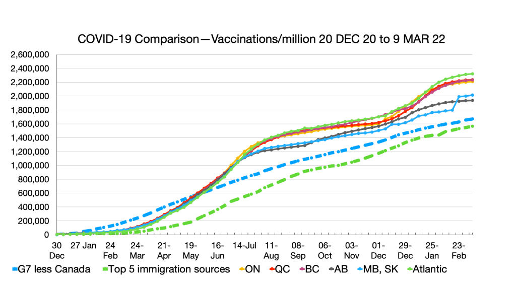 Vaccinations: Some minor shifts but convergence among provinces and countries. Canadians fully vaccinated 82.4 percent, compared to Japan 79.5 percent, UK 73.5 percent and USA 65.9 percent.