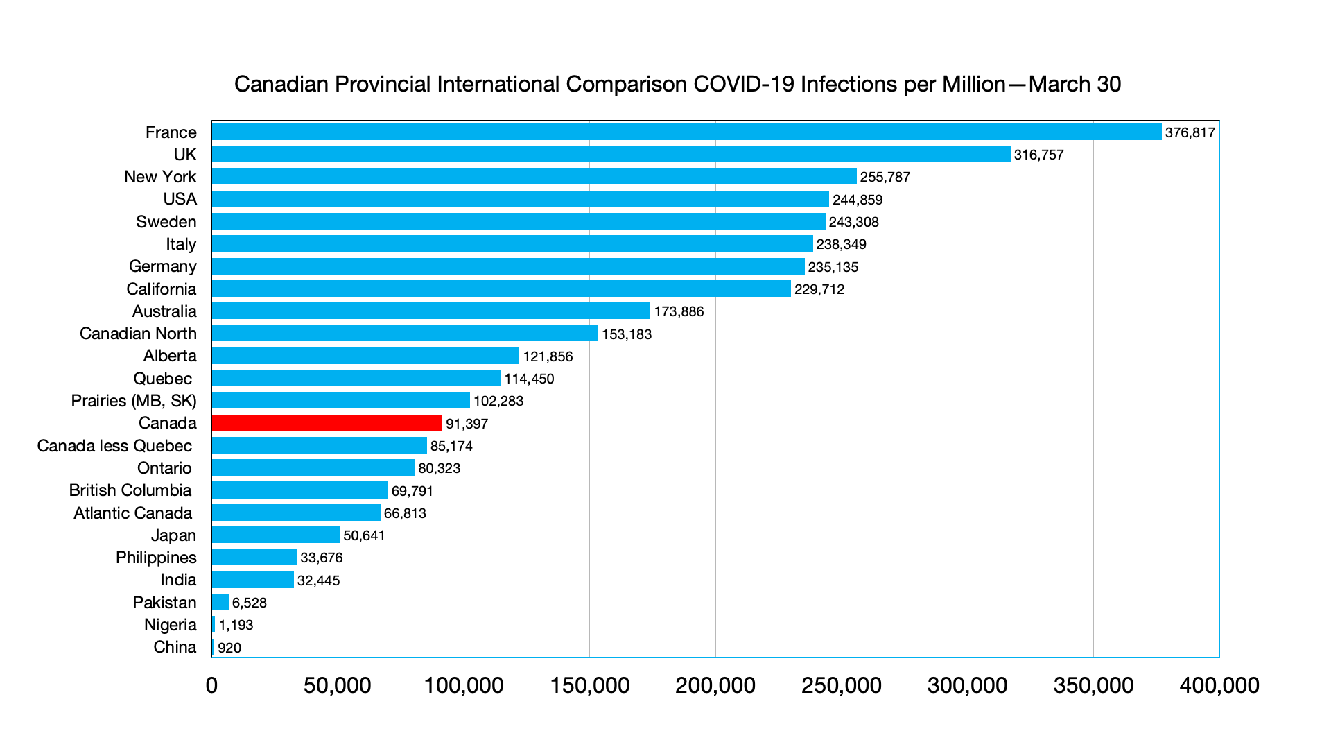 Infections: Italy ahead of New York, Australia ahead of California, Atlantic Canada ahead of Canada less Quebec, China ahead of Nigeria.