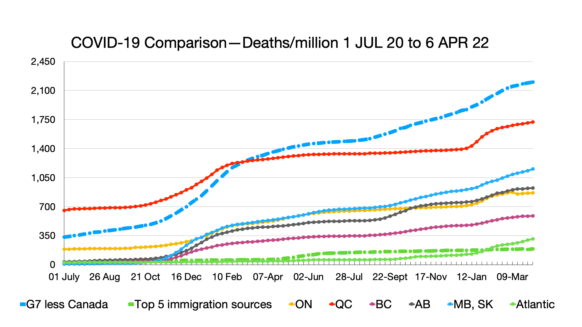 Deaths: Quebec continues to plateau with moderate increases in other provinces but G7 still not plateauing.