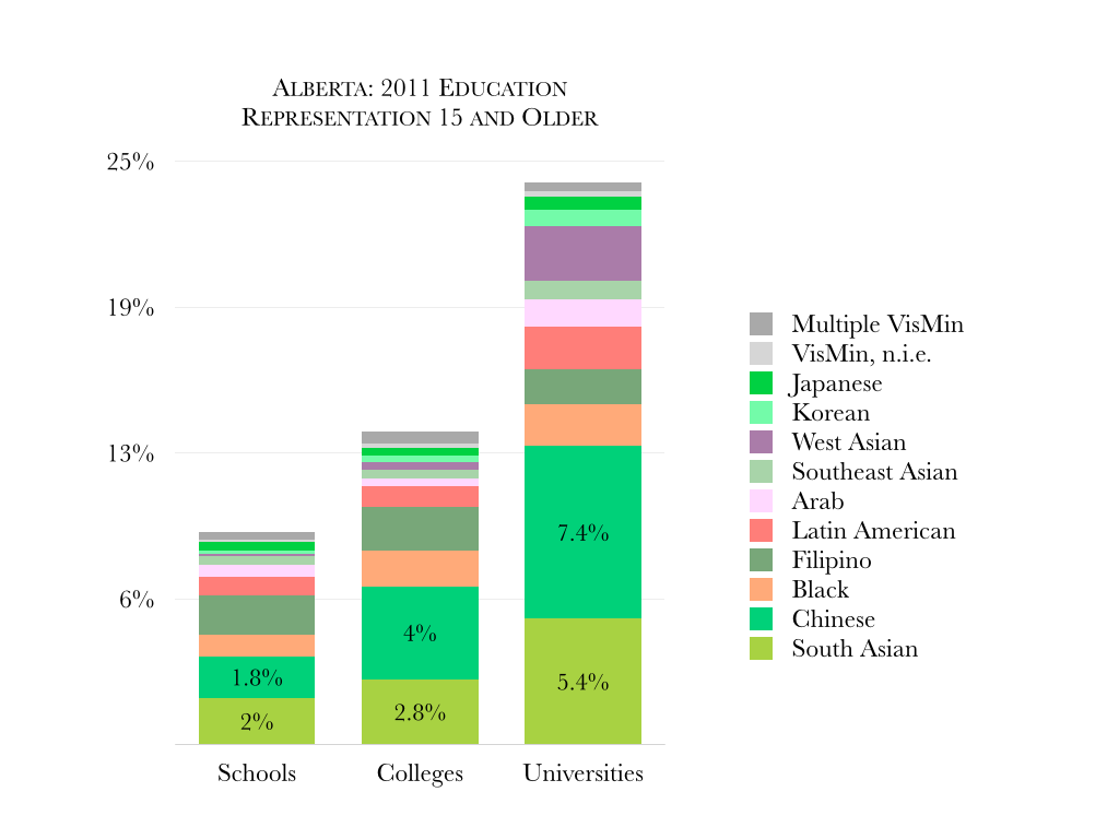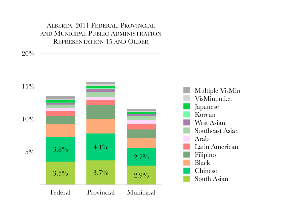 The above charts from my forthcoming book, Multiculturalism in Canada: Evidence and Anecdote, highlight this change from a diversity angle, with Alberta having overtaken Quebec as Canada’s third most diverse province, with strong visible minority representation in healthcare, social services, universities, and provincial government public administration.