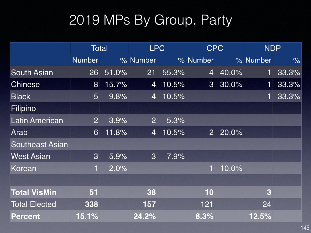 The above chart provides a breakdown of MPs by visible minority groups and party (no visible minority Bloc or Green MPs). South Asians form over half of Liberal visible minority MPs.