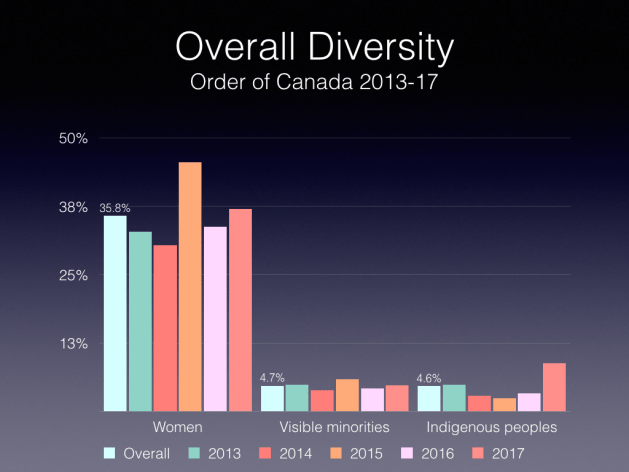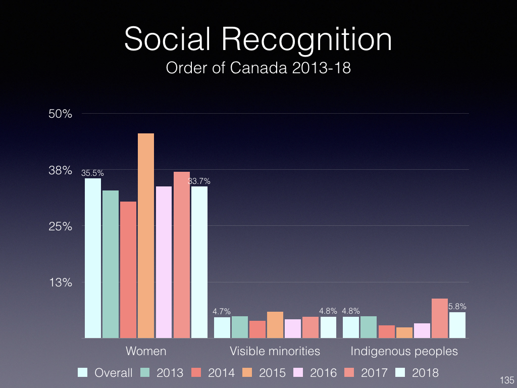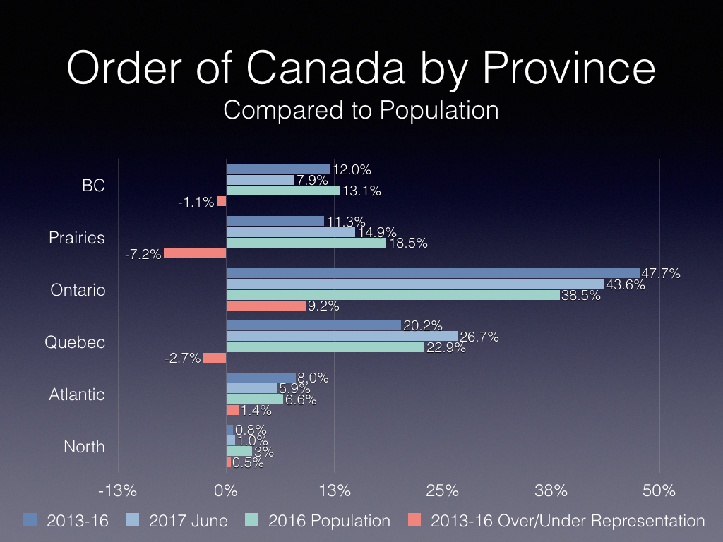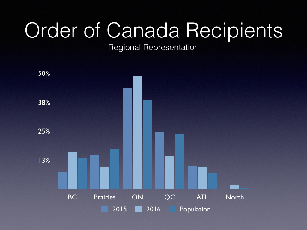 This article does beg the question of whether this is a real issue compared to other under-representation. While the public service initiative is with respect to the wide range of awards under the Governor General, I have looked at Order of Canada recipients.
