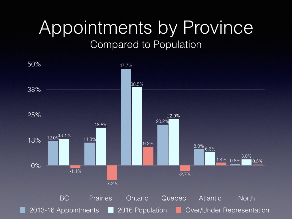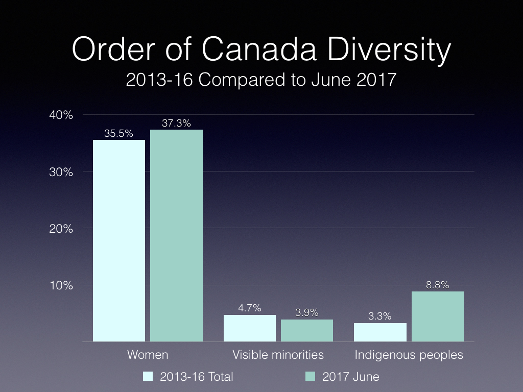 Under the previous government, there were efforts to improve representation with respect to regional representation (e.g., under-representation in the West, over-representation in Ontario and Quebec) and under-representation of the business community (see my earlier The Order of Canada and diversity).