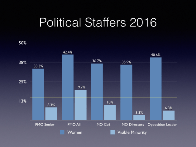 “As many of the offices you surveyed have a smaller number of staff, information shared detailing individual’s race and gender by each office could very much identify individual staff. So to ensure the privacy of individuals is maintained, we asked Minister’s Offices to share information in a manner that was both anonymous and voluntary,” said PMO press secretary Alex Wellstead in an email.