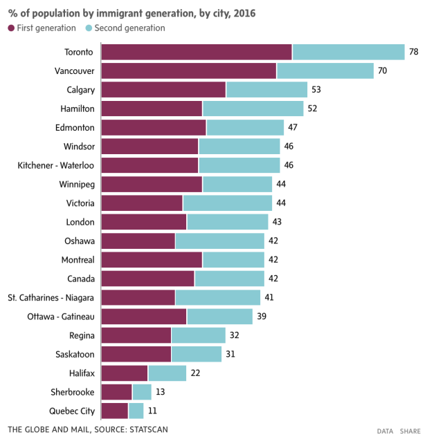 But it’s not just the fact of urban living that matters; it’s also the nature of the cities. Canadian cities are some of the most diverse on Earth. The populations of two of its largest, Toronto and Vancouver, are almost half foreign-born and more than two-thirds first– or second-generation Canadian. Our cities are largely products of postwar immigration. The past half-century has been especially important: Canada retired its explicitly racist immigration policies in the 1960s, moving to a points system prizing education and language proficiency, leading to huge inflows of talent, energy and youth from around the world.