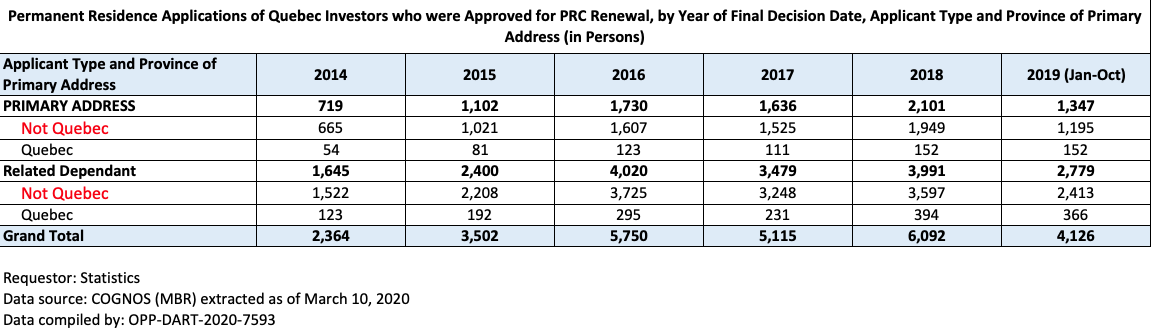 En 2020, 184 606 résidents permanents ont été enregistrés au Canada, c’est-à-dire beaucoup moins que la cible annoncée de 341 000, confirme également ce rapport annuel. Ce nombre, selon le ministre Fraser, est néanmoins un « succès impressionnant compte tenu des fermetures et des restrictions frontalières » dues à la pandémie, y écrit-il.