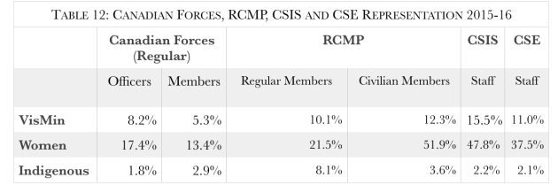 The above table contrasts the overall representation of the Canadian Forces, RCMP, CSIS and CSE. The latter two organizations, more intelligence-driven than the CF and RCMP, indicate some hope for the strategy: